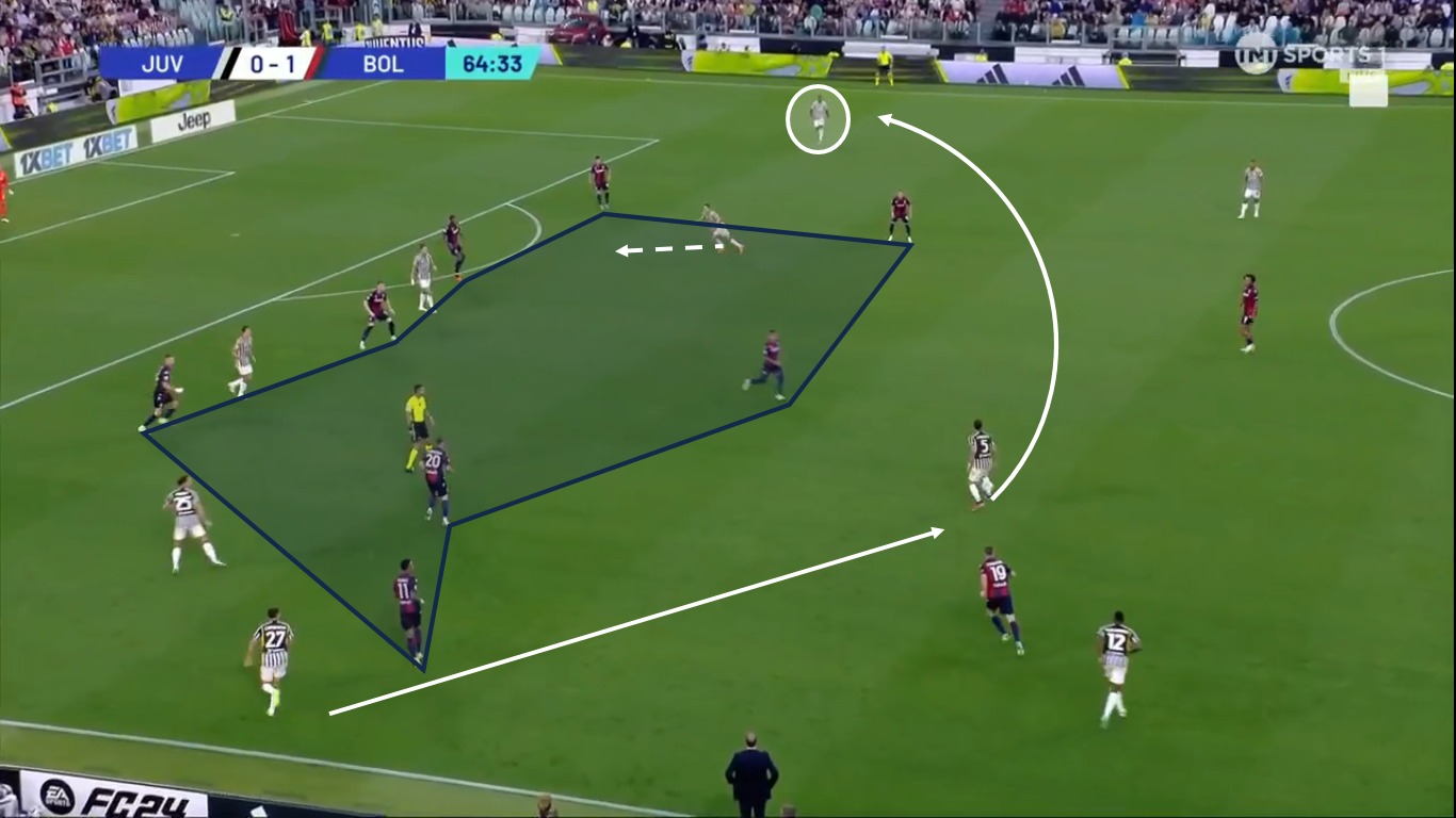 La fase di costruzione del Bologna è spesso elaborata e ragionata, i rossoblù sono infatti primi in Serie A per tocchi nella propria trequarti (240 a partita) e secondi per tocchi all’interno della propria area di rigore (76 a partita). Come già accennato in precedenza, la fluidità è un elemento che contraddistingue la fase di possesso dei felsinei, quindi possiamo vedere con frequenza delle rotazioni in una zona del campo, per liberare uno spazio prossimo a quello di densità. Nella seguente situazione Beukema si prende dei metri in avanti, Posch si accentra, mentre Ferguson scivola alla sua destra, attirando su di sé l'esterno e la mezzala della Juventus, il movimento di Aebischer tiene impegnato Locatelli, e in questo modo Ndoye può isolarsi a destra contro Alex Sandro.