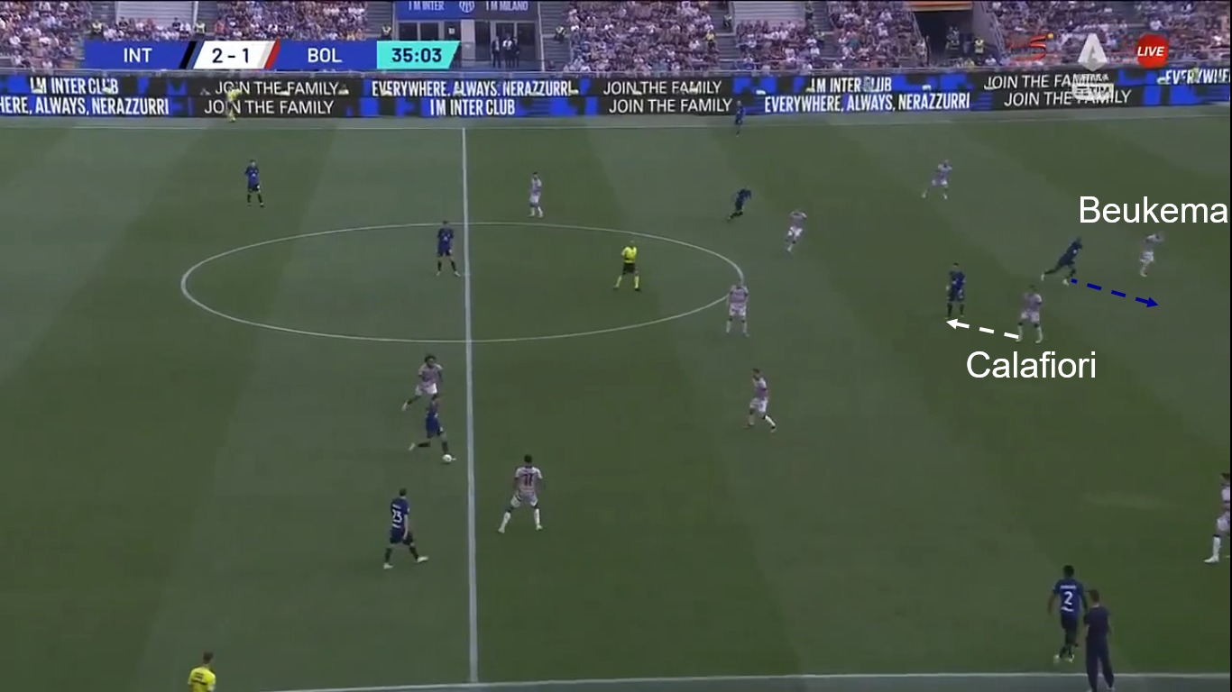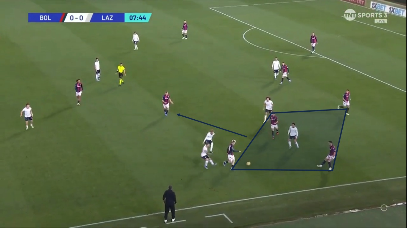 L’obiettivo principale del Bologna è quello di sovraccaricare un lato per attaccare velocemente quello opposto, cercando l’ala in ampiezza. In questo caso, si viene a creare un quadrilatero formato da Calafiori, Lykogiannis, Freuler e Saelemaekers, mentre Ferguson funge da elemento di transito per andare a trovare Orsolini sul lato debole.