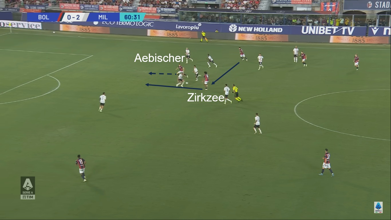 La produzione offensiva del Bologna è calata rispetto all’anno scorso, dato che la squadra è quintultima in campionato per numero di Expected Goals, ma a discapito di questo dato, sono tra le squadre più precise al tiro, infatti il 40,8% delle conclusioni terminano verso lospecchio della porta, il numero più alto in Serie A. In zona di rifinitura, Zirkzee assume un’importanza ancora maggiore, dove non si comporta da vero attaccante d’area di rigore, ma quasi da seconda punta, muovendosi verso il portatore di palla per legare il gioco. Contro le marcature a uomo del Milan, l’olandese viene incontro ad Orsolini, liberando uno spazio che viene attaccato da Aebischer, servito poi