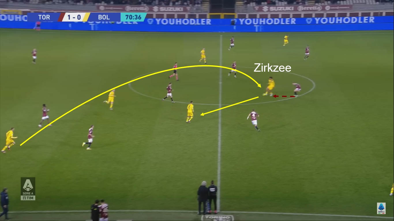 Un’altra soluzione è quella di giocare direttamente verso Zirkzee, che può ricevere spalle alla porta e scaricare al centrocampista più vicino, che può a sua volta servire l’inserimento dell’ala in profondità: questa soluzione ha messo in grande difficoltà il Toro nella gara di ritorno della scorsa stagione.