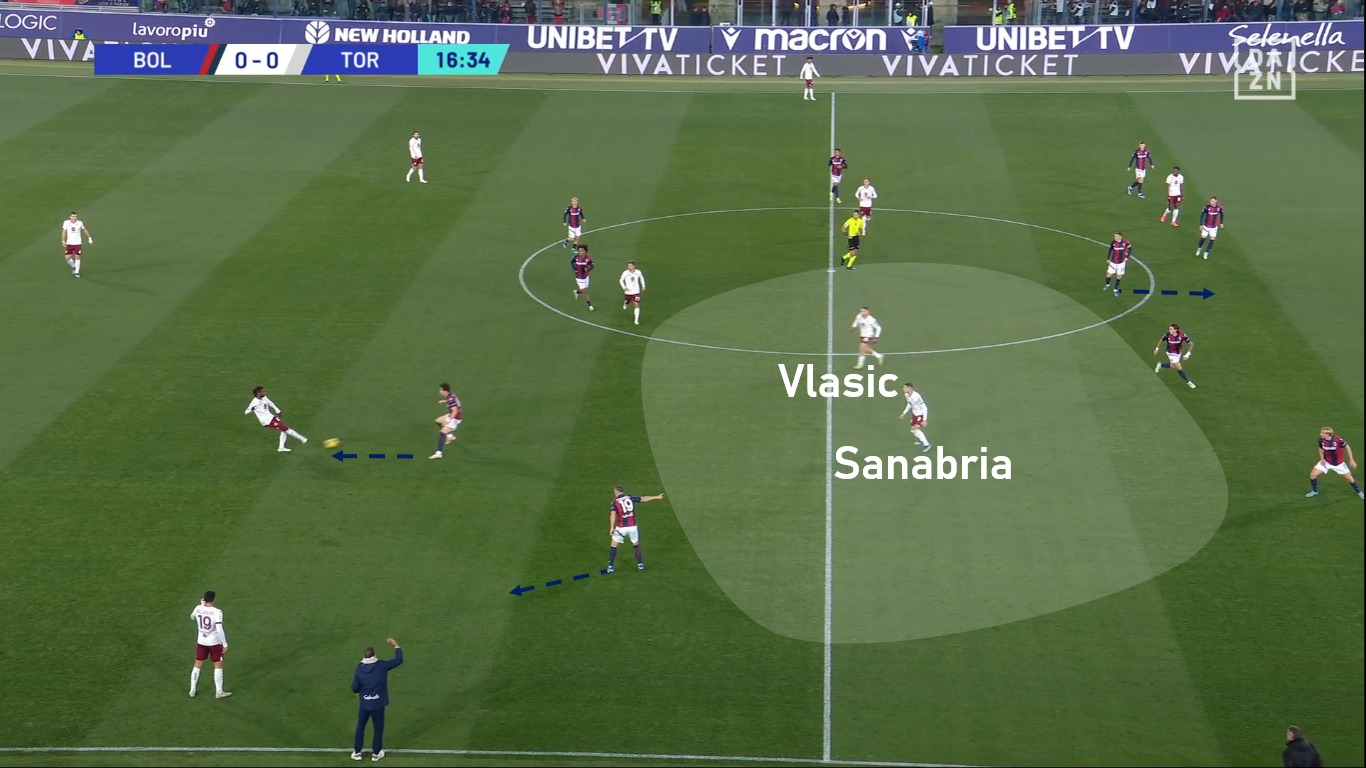 Un altra chiave che ha ostacolato il Bologna, è stata la costante imbucata in direzione di Zapata. Come attendevamo, i due difensori centrali potevano disgregarsi facilmente, con Calafiori che ha infatti marcato a uomo Sanabria e Beukema che ha seguito gli inserimenti di Zapata. Il colombiano ha messo in difficoltà il difensore olandese, che spesso non è riuscito a contenerlo, come in occasione del gol del vantaggio di Vlasic (poi annullato), sviluppato in seguito ad un movimento in profondità dell'attaccante del Toro.