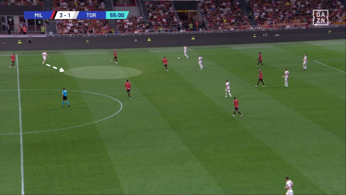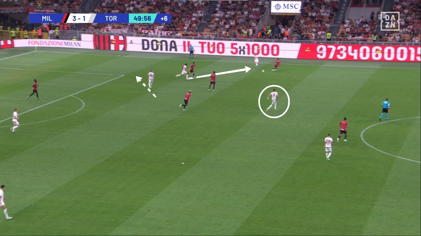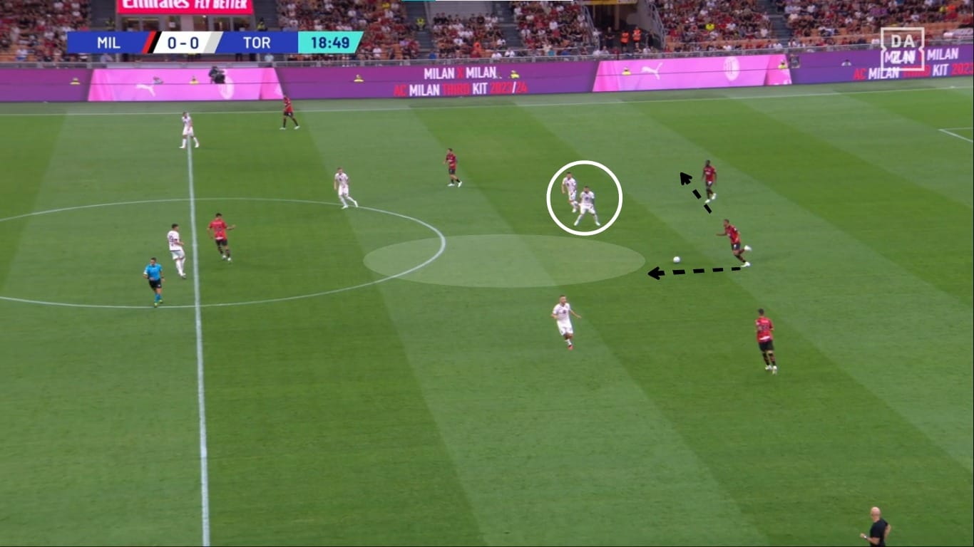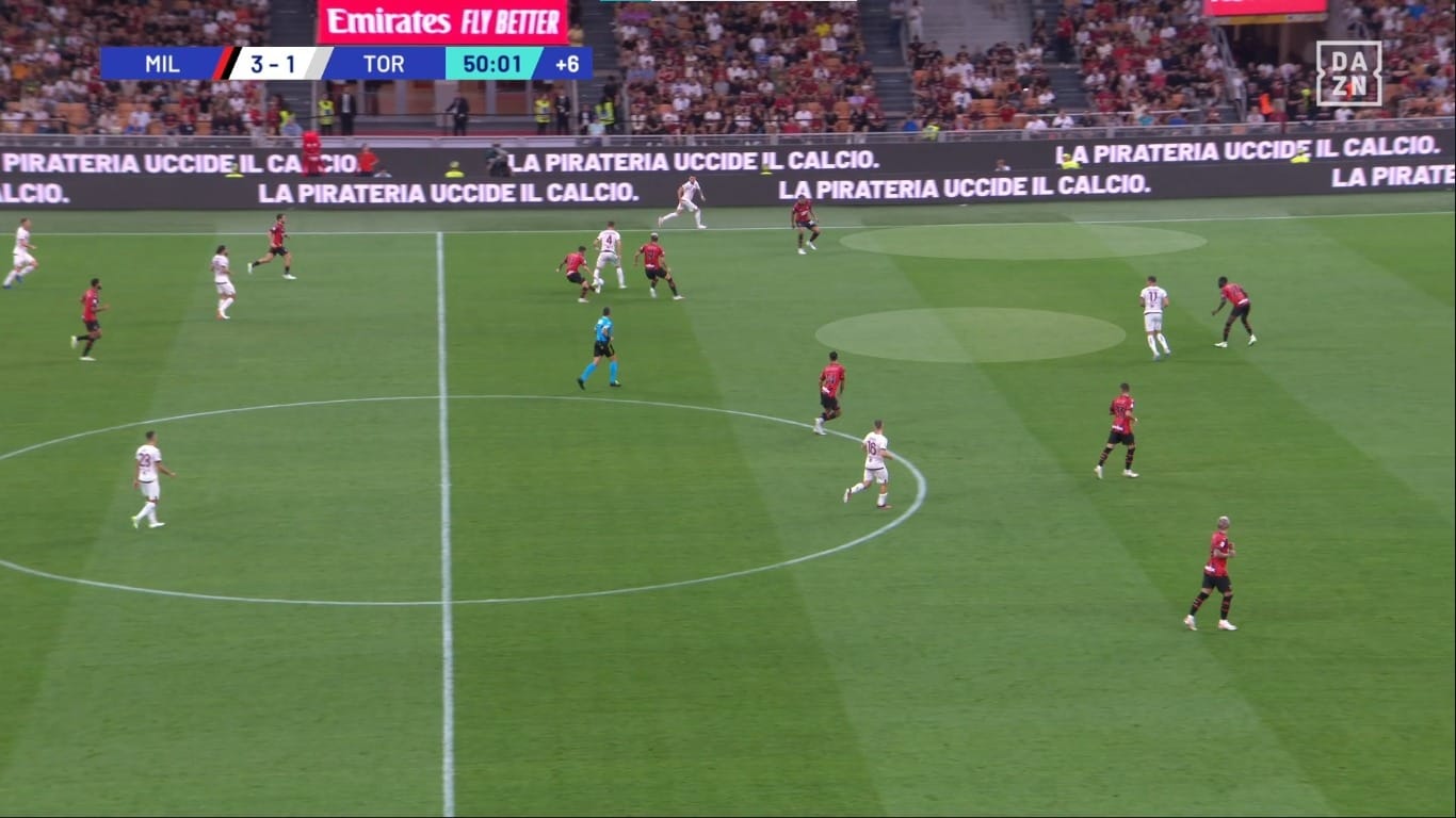 Il movimento dentro al campo da parte dei terzini ha causato problemi anche nella metà campo granata. Come vediamo dall'immagine, Theo Hernandez riceve un passaggio nel mezzo spazio sinistro, e Bellanova ha due scelte: andarlo a marcare e lasciare Leao 1v1 contro Schuurs, oppure coprire la sua zona di competenza e lasciare libero il francese. Di conseguenza il Milan ha creato ottime occasioni con questi presupposti.