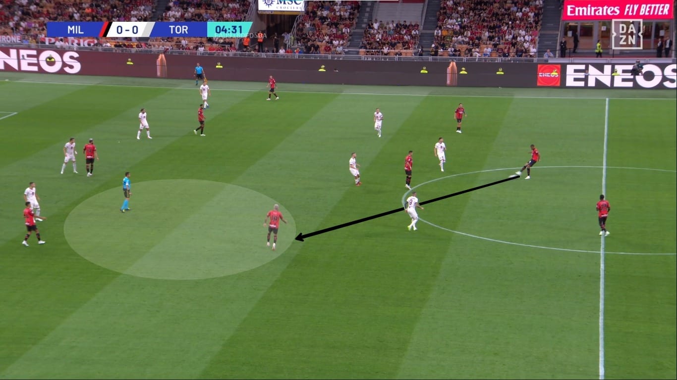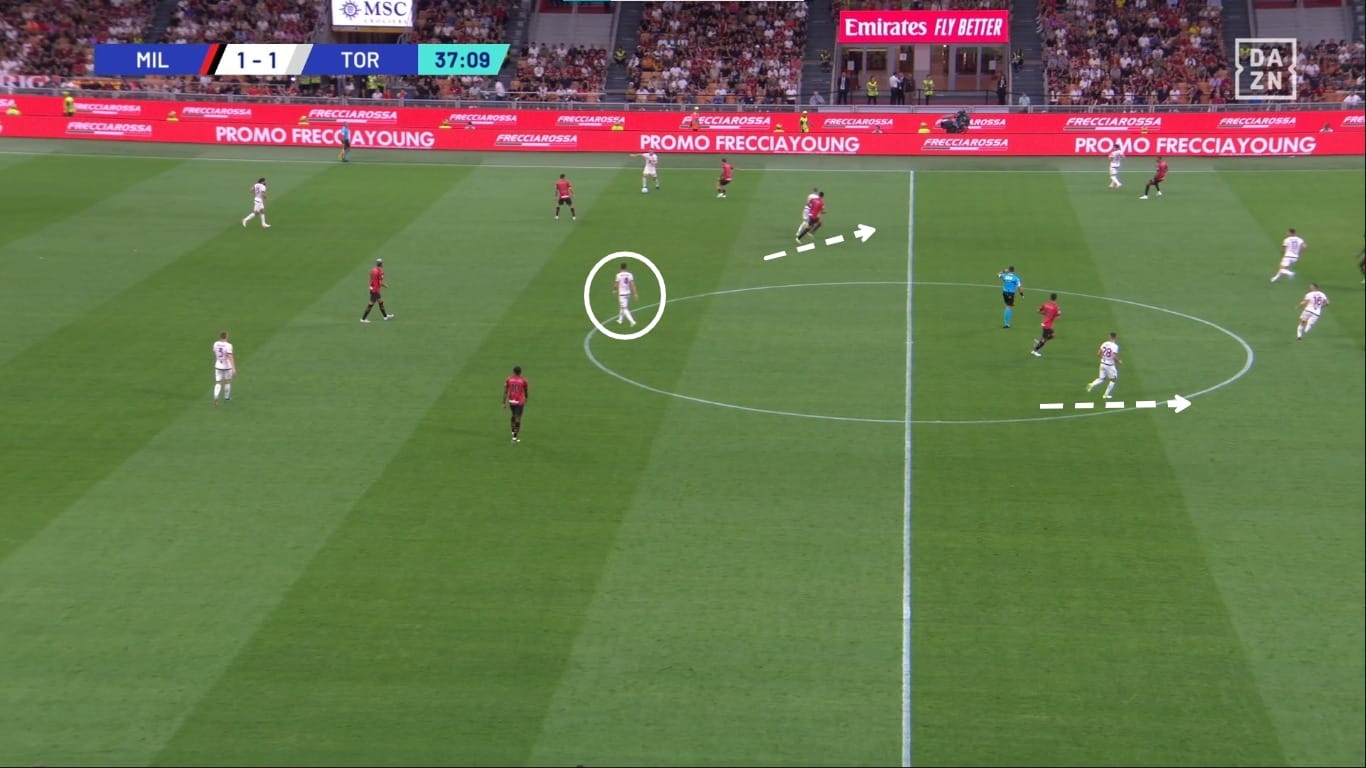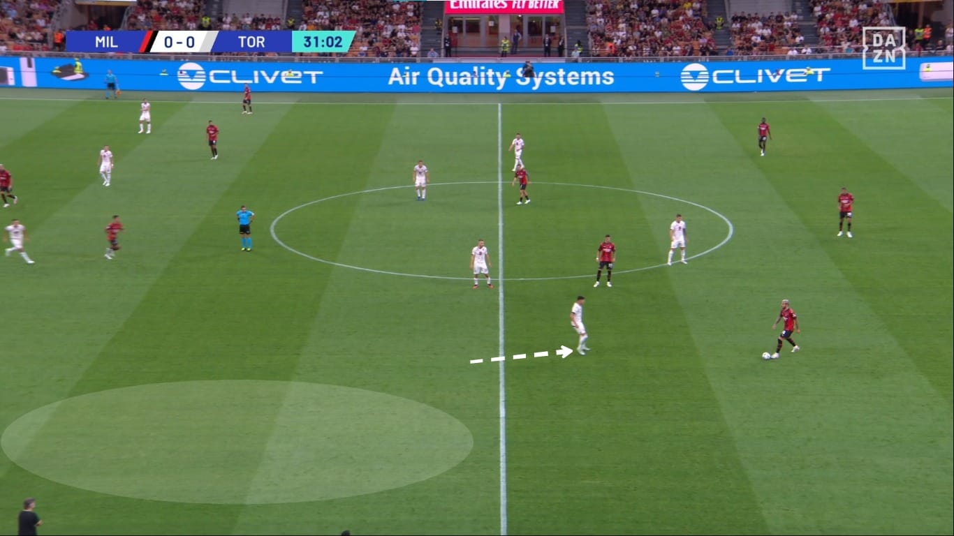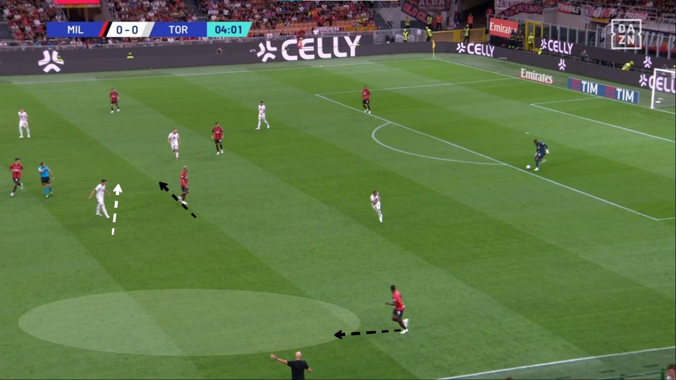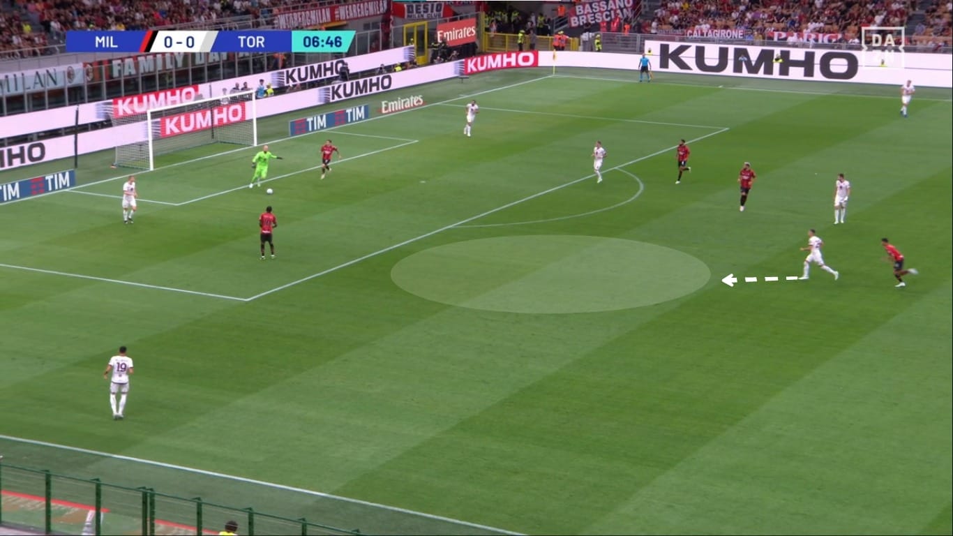 Il movimento dentro al campo da parte dei terzini ha causato problemi anche nella metà campo granata. Come vediamo dall'immagine, Theo Hernandez riceve un passaggio nel mezzo spazio sinistro, e Bellanova ha due scelte: andarlo a marcare e lasciare Leao 1v1 contro Schuurs, oppure coprire la sua zona di competenza e lasciare libero il francese. Di conseguenza il Milan ha creato ottime occasioni con questi presupposti.
