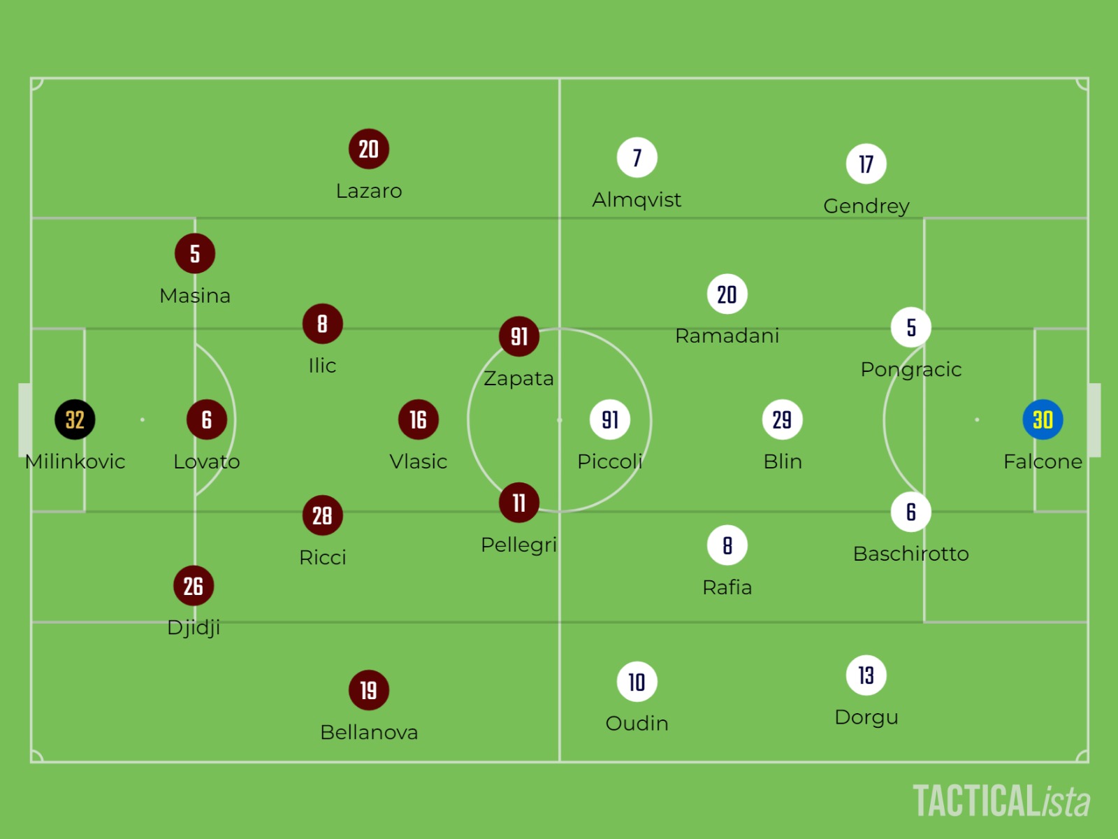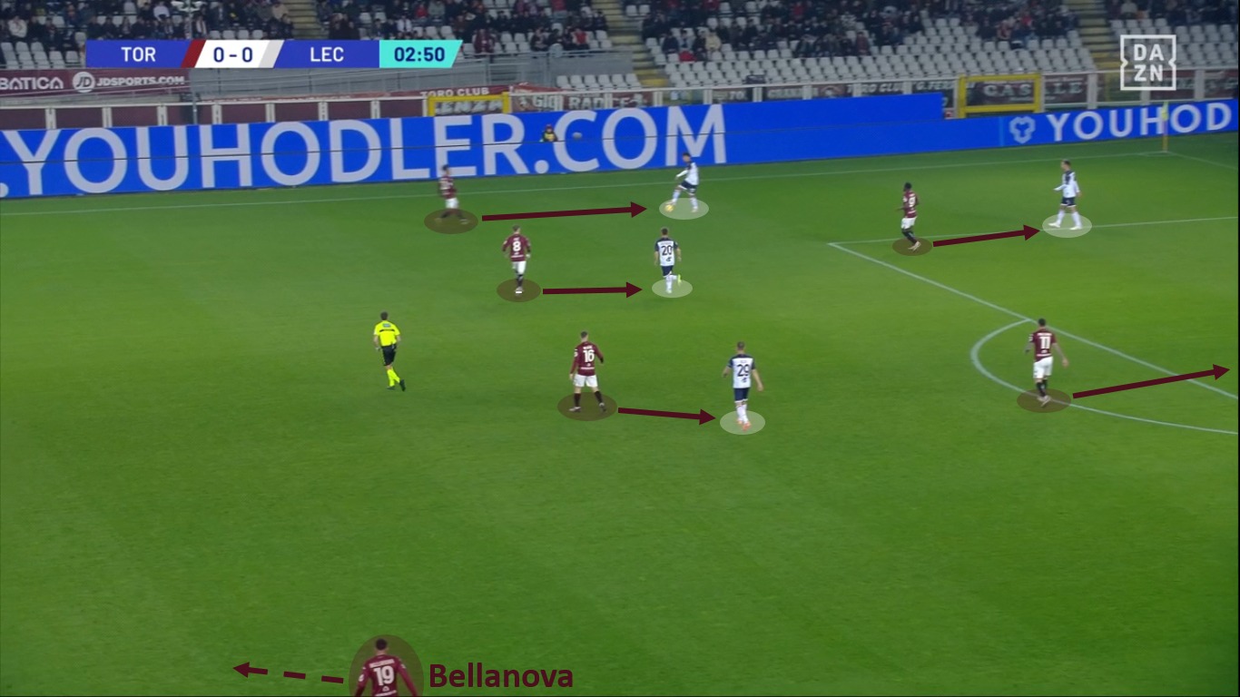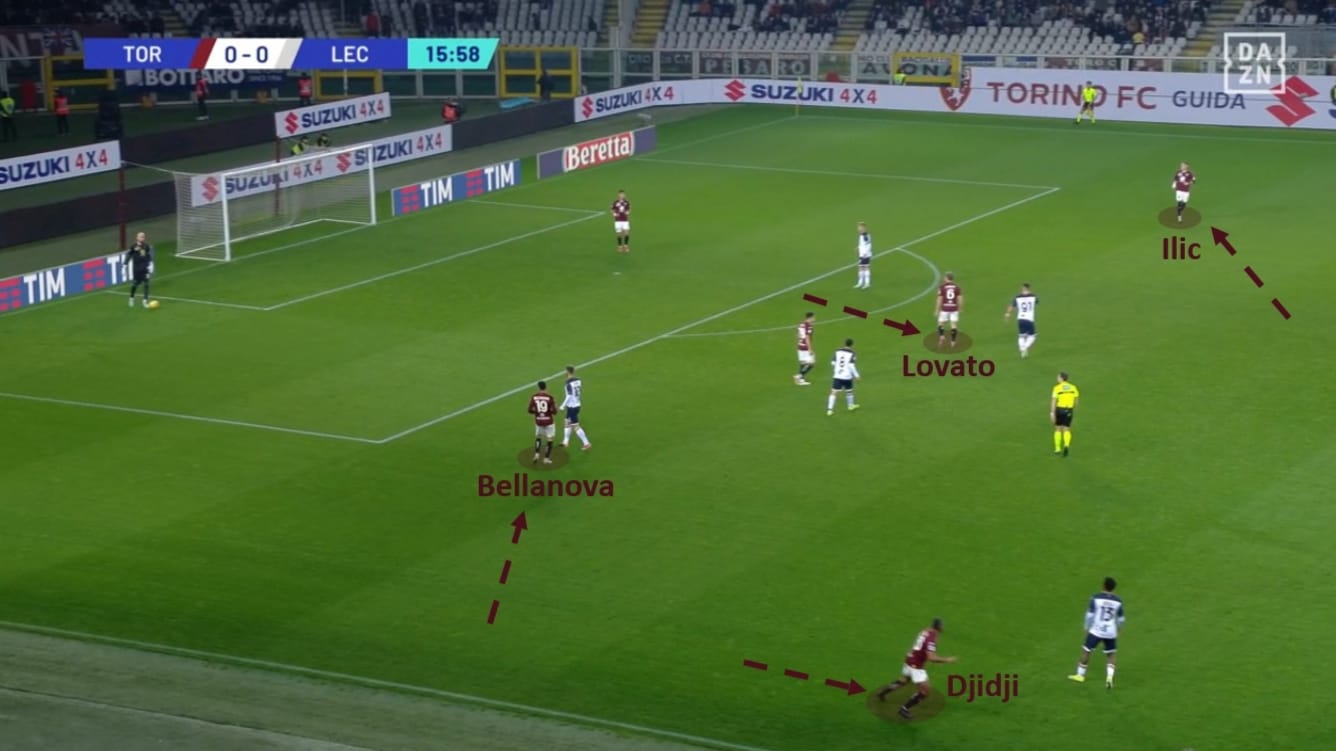 I granata però non potevano appoggiarsi solo a Bellanova, ma dovevano trovare anche altre soluzioni per scardinare le marcature a uomo avversarie. Nella seguente schermata vediamo tante rotazioni con lo scopo di mandare in confusione le marcature: Lovato sale a centrocampo, Bellanova si scambia di ruolo con Djidji e Ilic scivola in basso a sinistra.