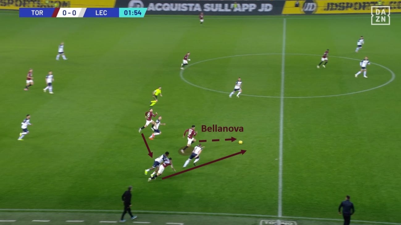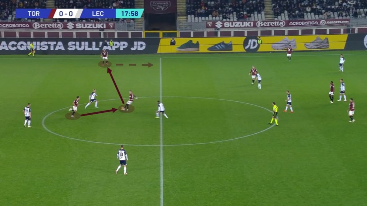 Sul lato destro, il Toro aveva la possibilità di sfruttare questo aspetto a proprio favore: quando Dorgu si alzava in pressione, si liberava uno spazio dietro di lui, quindi Bellanova poteva effettuare un dai e vai con Vlasic o Pellegri per attaccare lo spazio alle spalle del suo marcatore.