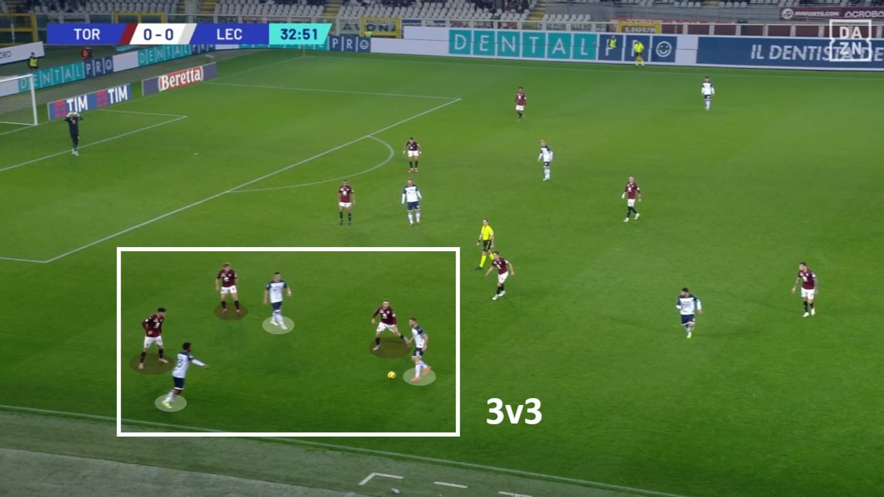 Come anticipato da Juric in conferenza stampa, il Lecce non si è limitato a fare una partita attendista, bensì ha cercato di disturbare dal principio la prima costruzione dei granata. La squadra di D’Aversa è nota per essere la quarta in Serie A con il PPDA più basso (dato che misura in modo decrescente l’intensità del pressing di una squadra): nella seguente immagine vediamo il tentativo di andare a marcare a uomo ogni riferimento sul lato del pallone.Sostanzialmente, il Lecce non ha apportato una pressione asfissiante, ma si è limitato a chiudere ogni linea di passaggio centrale e ogni sbocco laterale: quello che basta per mettere in difficoltà il Torino di Juric. In questo caso vediamo che Masina viene lasciato libero di impostare, ma senza nessuna opzione di passaggio nella zona centrale di campo.