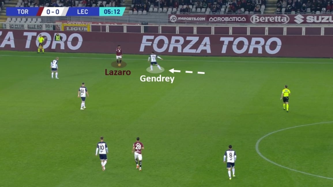 Se poi il gioco veniva indirizzato sulle fasce, il terzino lato palla avversario usciva forte in pressione sull’esterno di centrocampo che andava a ricevere: Gendrey su Lazaro e Dorgu su Bellanova.