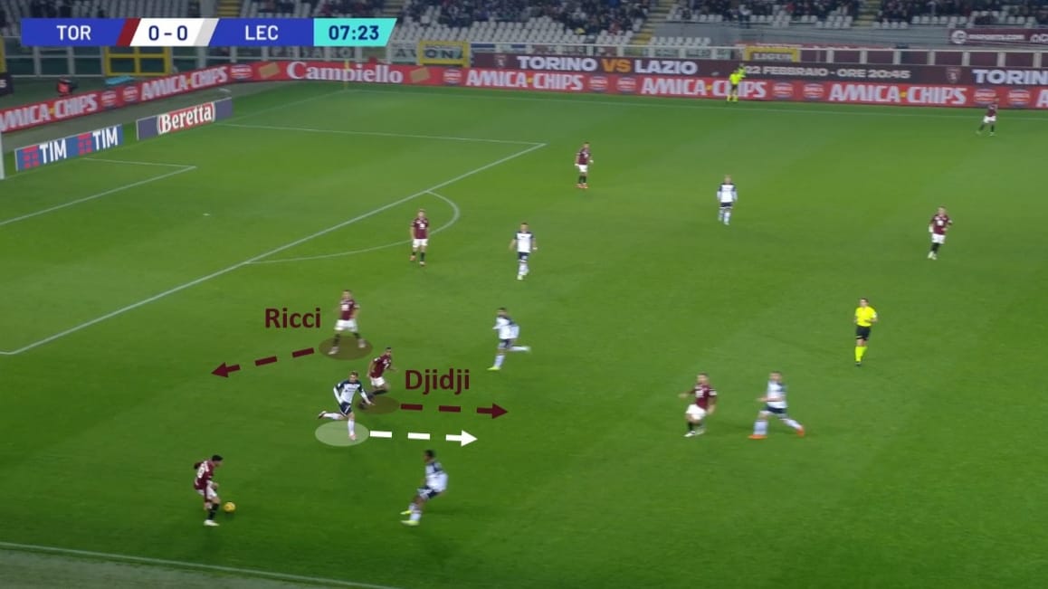 Un movimento molto più frequente era quello di Ricci che scivolava nella linea difensiva: in questo caso si scambia con Djidji, che come visto nel precedente caso, si spinge in avanti per portare via un uomo.
