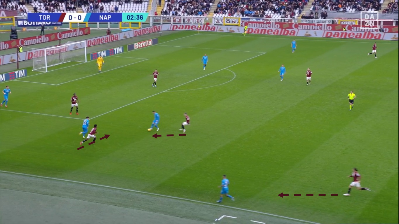 In fase di non possesso i granata hanno eseguito una pressione alta che ha messo in difficoltà gli avversari, spesso costretti a rilanciare lungo. Le marcature a uomo del 3-4-1-2 si sono adattate molto bene al 4-3-3 utilizzato in fase di costruzione dal Napoli, il quale ha cercato in tutti i modi di non rinunciare alla costruzione bassa, ma col passare del tempo in possesso del pallone, la pressione del Toro è aumentata sempre di più.