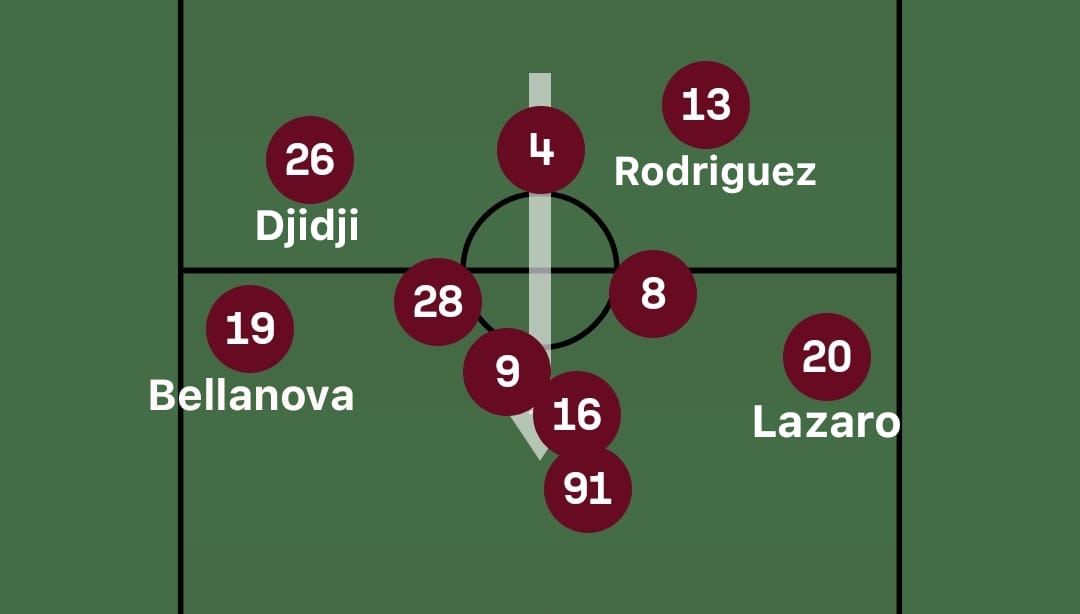 La posizione in ampiezza dei braccetti permetteva di liberare la linea di passaggio per i due centrocampisti Ricci e Ilic, incaricati di impostare il gioco.