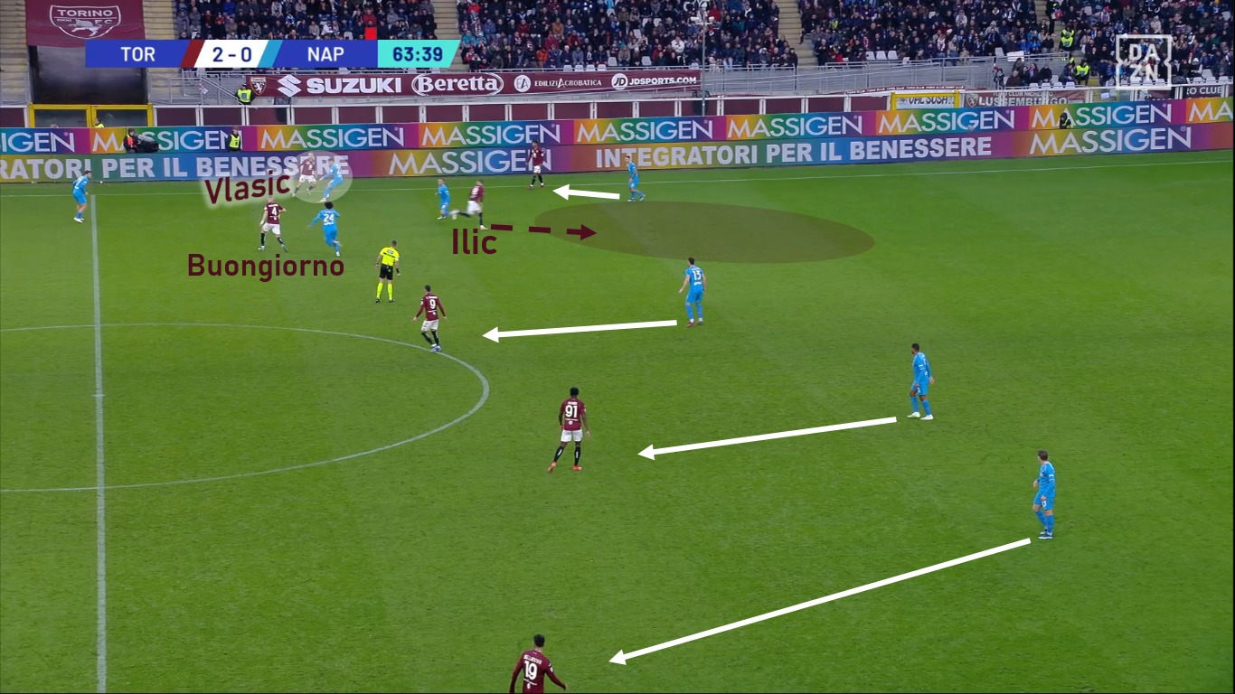 Da lì in poi i ritmi si sono abbassati da ambo le parti, ma è stato il Toro a generare comunque maggiori pericoli. Al minuto 64 i granata creano un'altra occasione d'oro: Vlasic viene incontro a Buongiorno, attirando su di sé la pressione di Di Lorenzo e liberando spazio per l’inserimento di Ilic, che corre alle spalle di Lobotka.