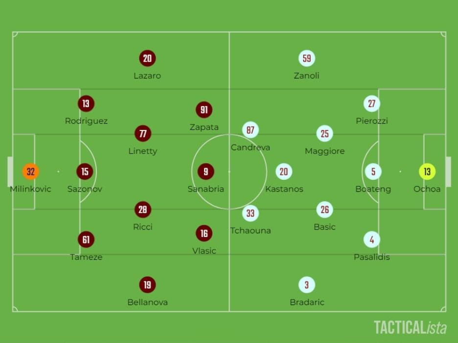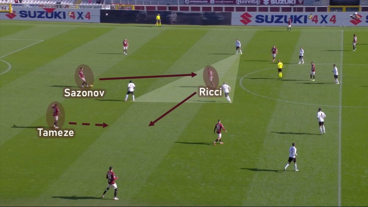 I primi 15 minuti di gioco sono stati di buon livello, la squadra sembrava aver preso la giusta rotta, dato con buona fluidità riusciva ad occupare bene gli spazi e valicare il blocco basso avversario. In fase di costruzione, per via dell’assenza di Buongiorno, la struttura è rimasta invariata, quando invece eravamo soliti vedere Buongiorno spostarsi a centrocampo. Per superare la pressione dei 3 attaccanti avversari, veniva utilizzato il principio del terzo uomo, con Sazonov che scaricava al centro su Ricci, il quale andava poi a cercare Tameze in posizione laterale.