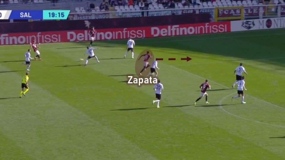 Invece Zapata è stato collocato nel mezzo spazio sinistro, agendo quasi come ala sinistra nei tre davanti. L'obiettivo era quello di sfruttare la sua rapidità in una zona più esterna.