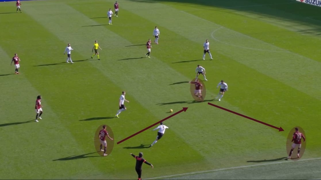 Lo sviluppo veniva indirizzato sulle catene laterali, dove anche in quella zona, veniva ben utilizzato il principio del terzo uomo per trovare il giocatore libero.