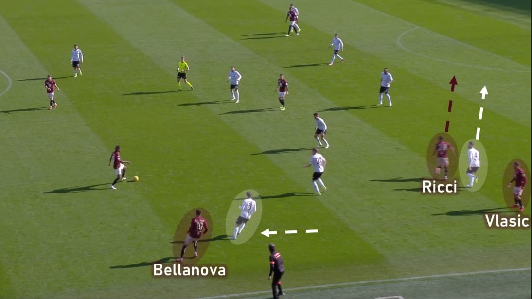 Le due mezzali si aprivano costantemente per costituire una catena, soprattutto Ricci, che ha svolto bene questo lavoro nei primi 10 minuti. Nella seguente immagine vediamo che si inserisce nel mezzo spazio destro, accoppiandosi col difensore avversario e liberando di fatto Vlasic, che arriverà poi sul fondo per mettere il cross.