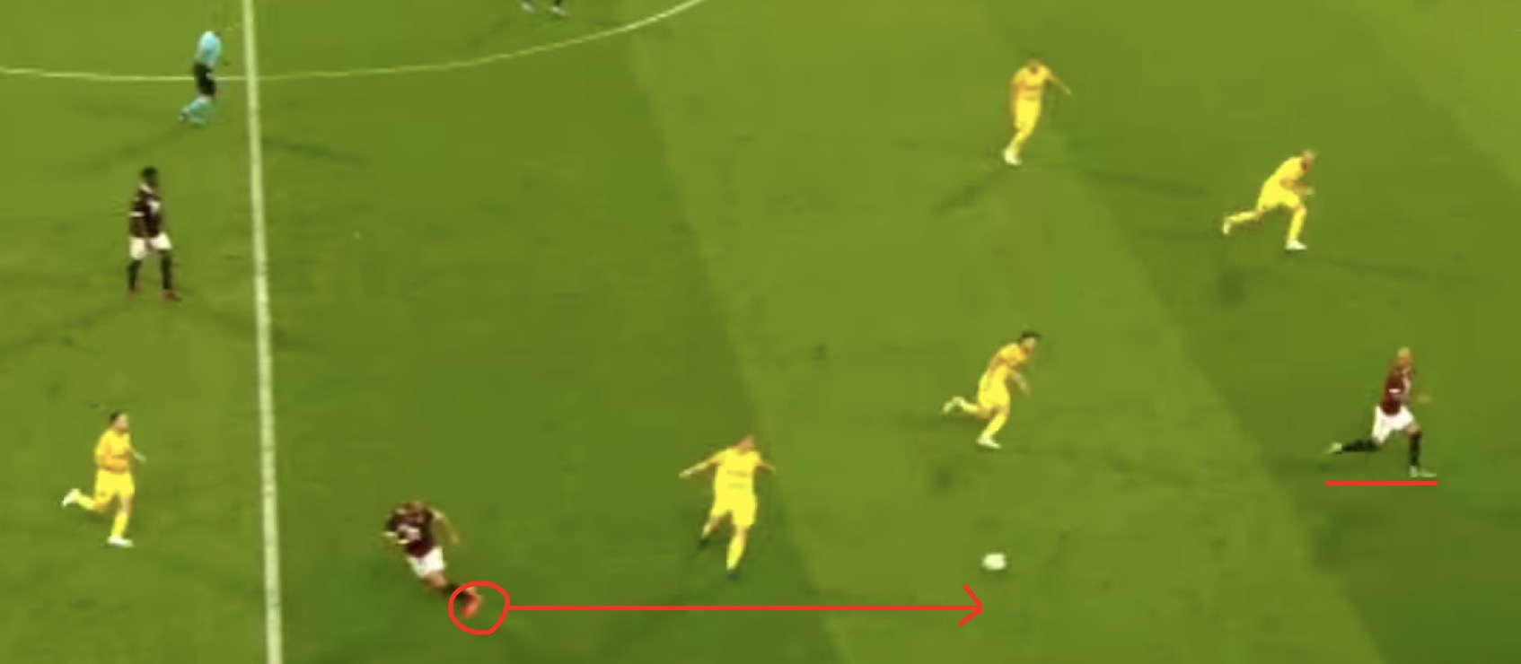 Dopo un ottimo controllo palla, l'attaccante ha accelerato ed è riuscito a saltare Khadarkevich in velocità. Bel numero del giocatore granata che si è avviato come un treno verso l'area di rigore avversaria.