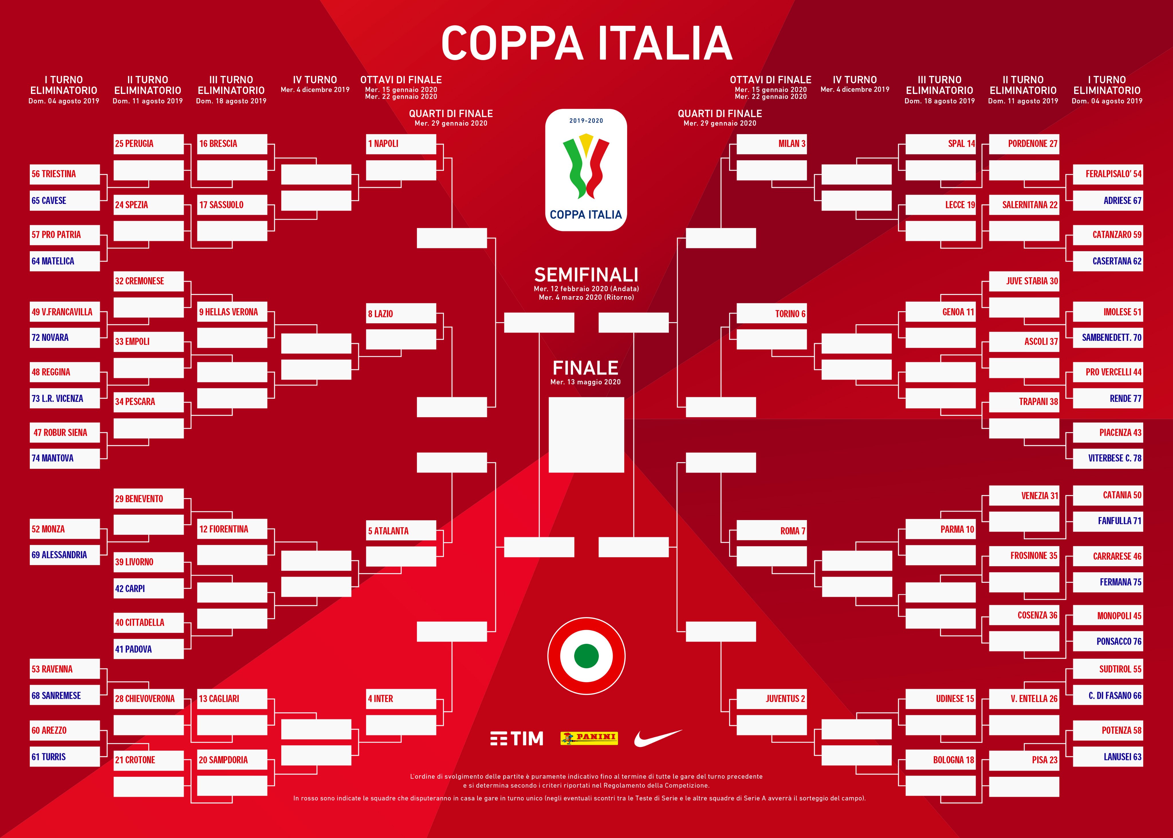 TABELLONE - Definito il tabellone, con il Torino che è stato inserito nello stesso lato del Milan (che può incontrare ai quarti) e del Genoa (che può incontrare agli ottavi). Il Torino giocherà il 15 gennaio 2020 in casa se l'avversario non dovesse essere una formazione del massimo campionato: viceversa sarà un sorteggio a determinare chi giocherà tra le mura amiche. Lo stesso dicasi per il quarto di finale. In semifinale (gara di andata e ritorno) i granata eventualmente potrebbero intercettare la Juventus.