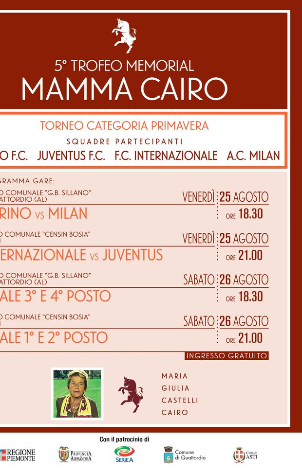 Il 25 agosto prenderà il via il consueto trofeo Mamma Cairo, giunto alla sua quinta edizione. Il torneo è riservato alla categoria Primavera ed è in ricordo della Signora Maria Giulia Castelli Cairo, madre del presidente del Torino morta il 1° ottobre 2012. Le squadre impegnate saranno quattro: il Torino, la Juventus, l’Inter e il Milan. I match si svolgeranno ad Asti ed a Quattordio presso gli stadi comunali "Censin Bosia" e "Sillano" nei giorni 25 e 26 agosto. La novità di quest'anno è proprio il palcoscenico dello stadio di Asti, che sostituisce come campo principale della manifestazione il "Moccagatta" di Alessandria.