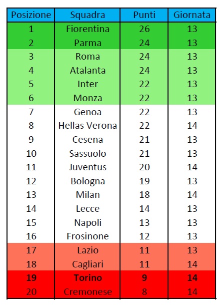 Come cambia la classifica dopo la gara tra bianconeri e granata