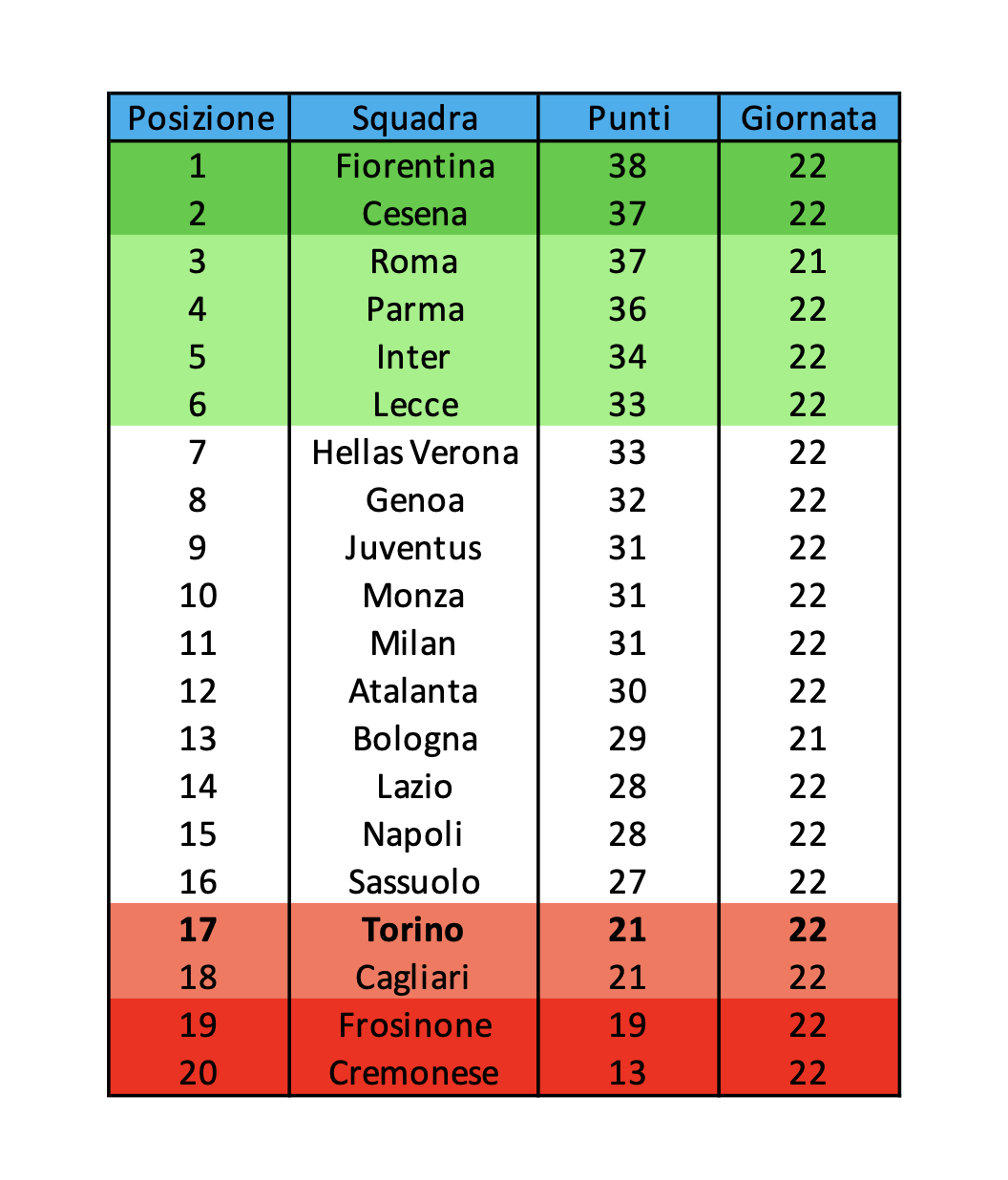 Il Torino esce da Parma con un punto guadagnato, ma con la zona salvezza ancora lontana. Il risultato di oggi ha un sapore amaro, poiché è stato fortemente condizionato dalla netta espulsione di Santer: l'estremo difensore ha tentato il dribbling su Mikolajewski ma ha perso palla, commettendo poi fallo da ultimo uomo. Nel match precedente della ventiduesima giornata di campionato anche il Cagliari ha trovato il pareggio, non riuscendo quindi a superare i granata. La squadra di Baldini resta così al diciassettesimo posto con 21 punti (davanti ai sardi in virtù dello scontro diretto visto) con la salvezza diretta distante 7 punti. Il gap c'è, ma va detto che il Toro ha affrontato nelle ultime due partite due squadre in lotta per lo scudetto contro cui non era scontato fare punti. Nel prossimo turno Baldini affronterà un’altra formazione affamata di vittorie, la Fiorentina capolista, che intanto può anche ringraziare il Toro: il Parma, infatti, oggi aveva l’occasione di raggiungerla in vetta.