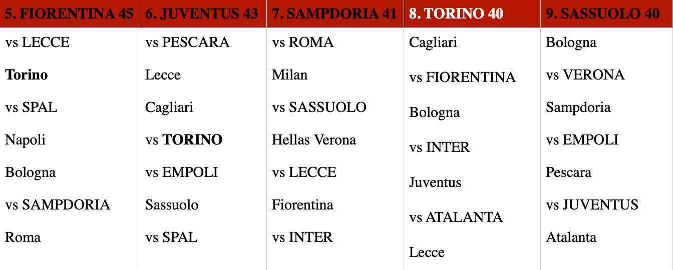 LE AVVERSARIE - Sulla carta il cammino più agevole sembra essere quello della Fiorentina, che avrà solamente due scontri diretti (uno con il Toro) e le altre gare saranno contro squadre sulla carta più indietro, fatta eccezione per l'ultima gara in casa della Roma. Il problema per la Viola è che le varie squadre potrebbero essere quasi tutte ancora in corsa per raggiungere i rispettivi obiettivi. Per la Juventus l'incognita potrebbe essere il cammino in Youth League, che rischia di distogliere l'attenzione della squadra dal campionato e che renderà ancora più intasato il percorso da qui a fine campionato. La Sampdoria è la squadra che ha il cammino più complicato, perché affronterà squadre potenzialmente di buon livello. Più agevole sulla carta quello del Sassuolo, che comunque disputerà due scontri diretti e chiuderà il campionato fuori casa contro l'Atalanta.