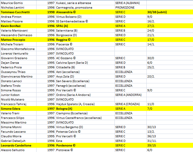 MOLTI PROFESSIONISTI - Due anche i ragazzi che hanno militato in Serie B: si tratta di Proia (25 presenze e 2 reti con il Cittadella) e Mantovani (24 presenze con la Salernitana). Chi probabilmente disputerà la serie cadetta la prossima stagione è Leonardo Candellone (39 presenze e ben 15 reti con il Pordenone in Serie C, dove era in prestito e con il quale ha conquistato la promozione: probabile il rinnovo del prestito anche la prossima stagione). Moltissimi anche i giocatori che hanno militato in Serie C, primo fra tutti il portiere Tommaso Cucchietti, 30 presenze con l'Alessandria: per lui l'anno prossimo futuro incerto, si pensa anche all'opzione vice-Sirigu.