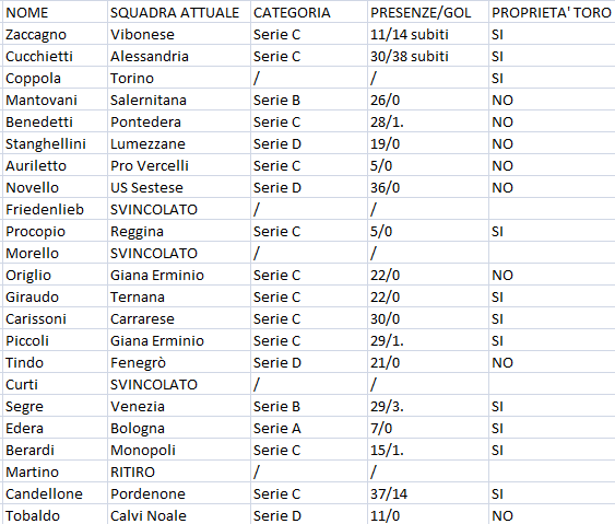 Molti sono ancora di proprietà del Torino: oltre lo stesso Edera, il Torino possiede il cartellino di Carissoni, Giraudo, Zaccagno e Cucchietti. Quasi tutti, come si evince dalla tabella, sono rimasti dalla Serie C in su: in particolare Segre e Mantovani militano in Serie B.