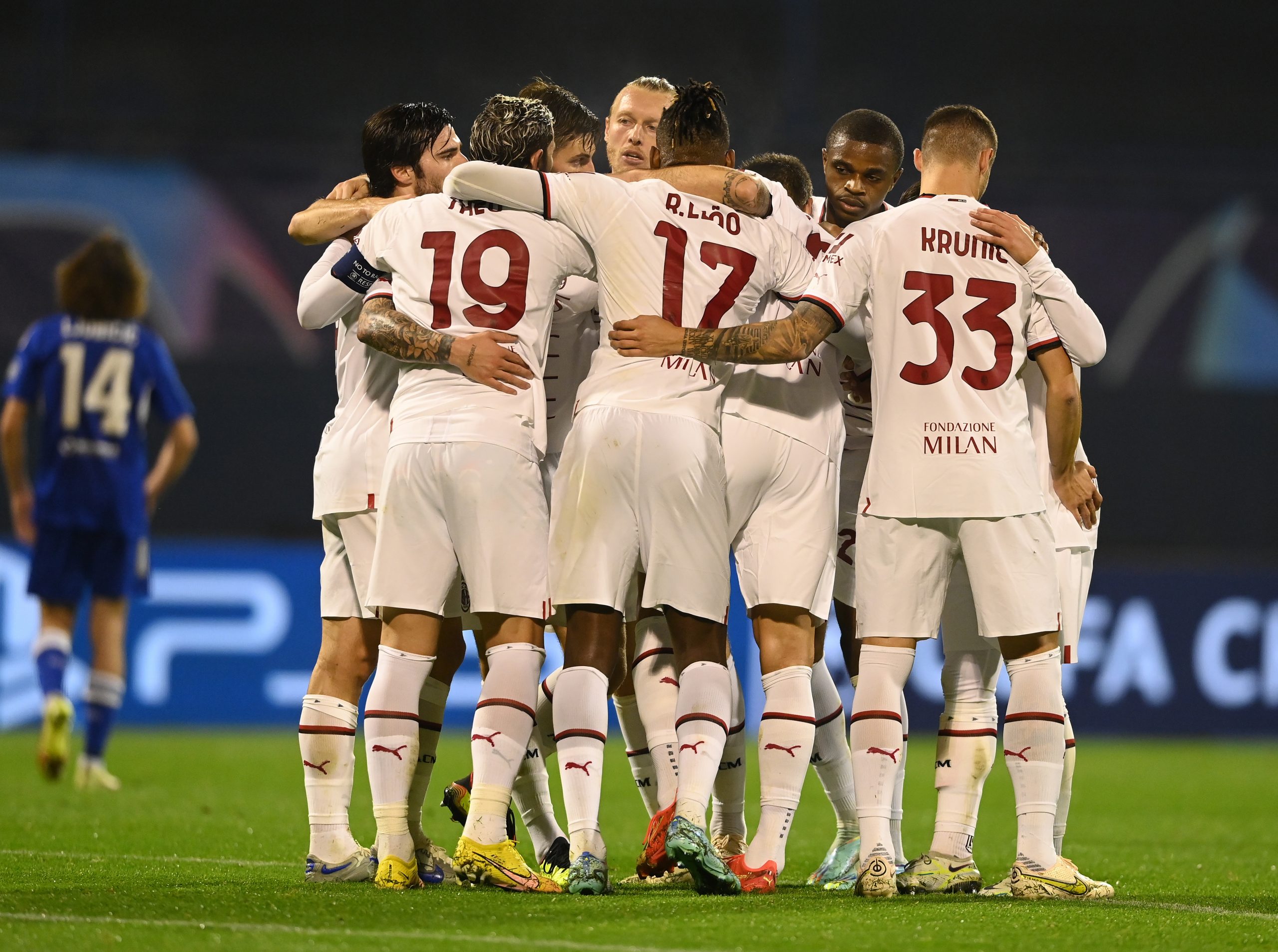 MILAN, ITALY - SEPTEMBER 14: Tommaso Pobega (L) of AC Milan celebrates his goal with his team-mate Theo Hernandez (R) and Rafael Leao (C) during the UEFA Champions League group E match between AC Milan and Dinamo Zagreb at Giuseppe Meazza Stadium on September 14, 2022 in Milan, Italy. (Photo by Marco Luzzani/Getty Images)