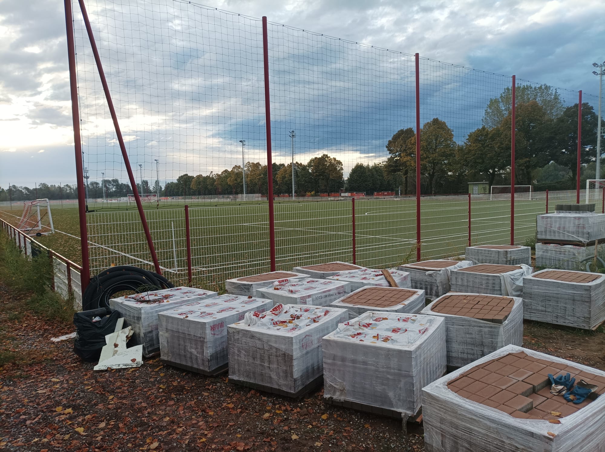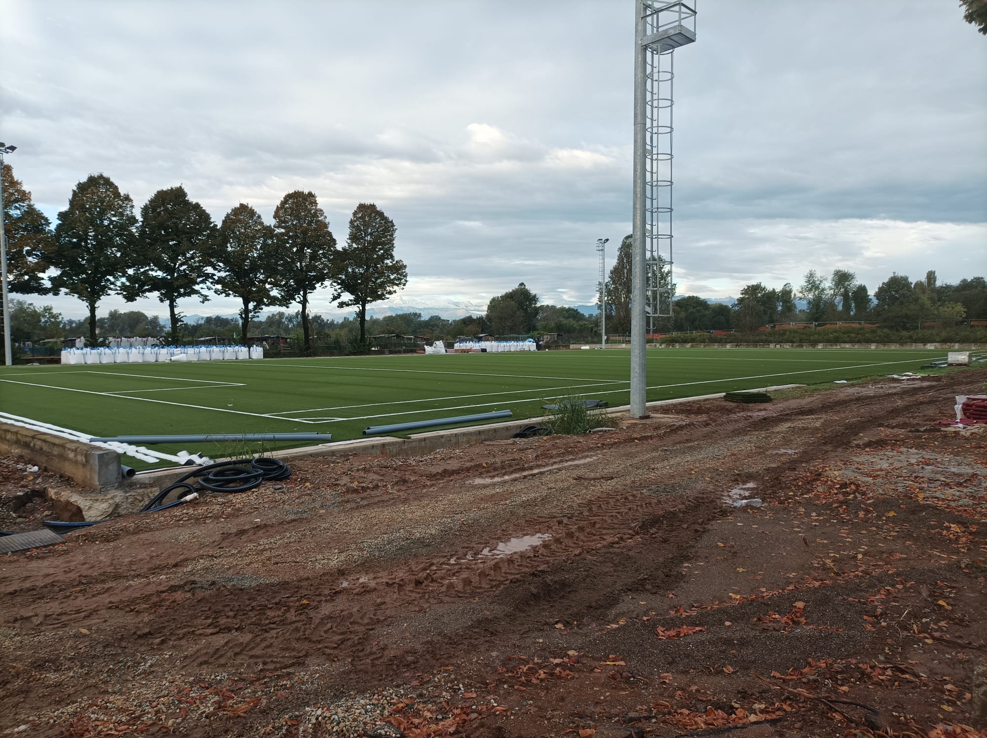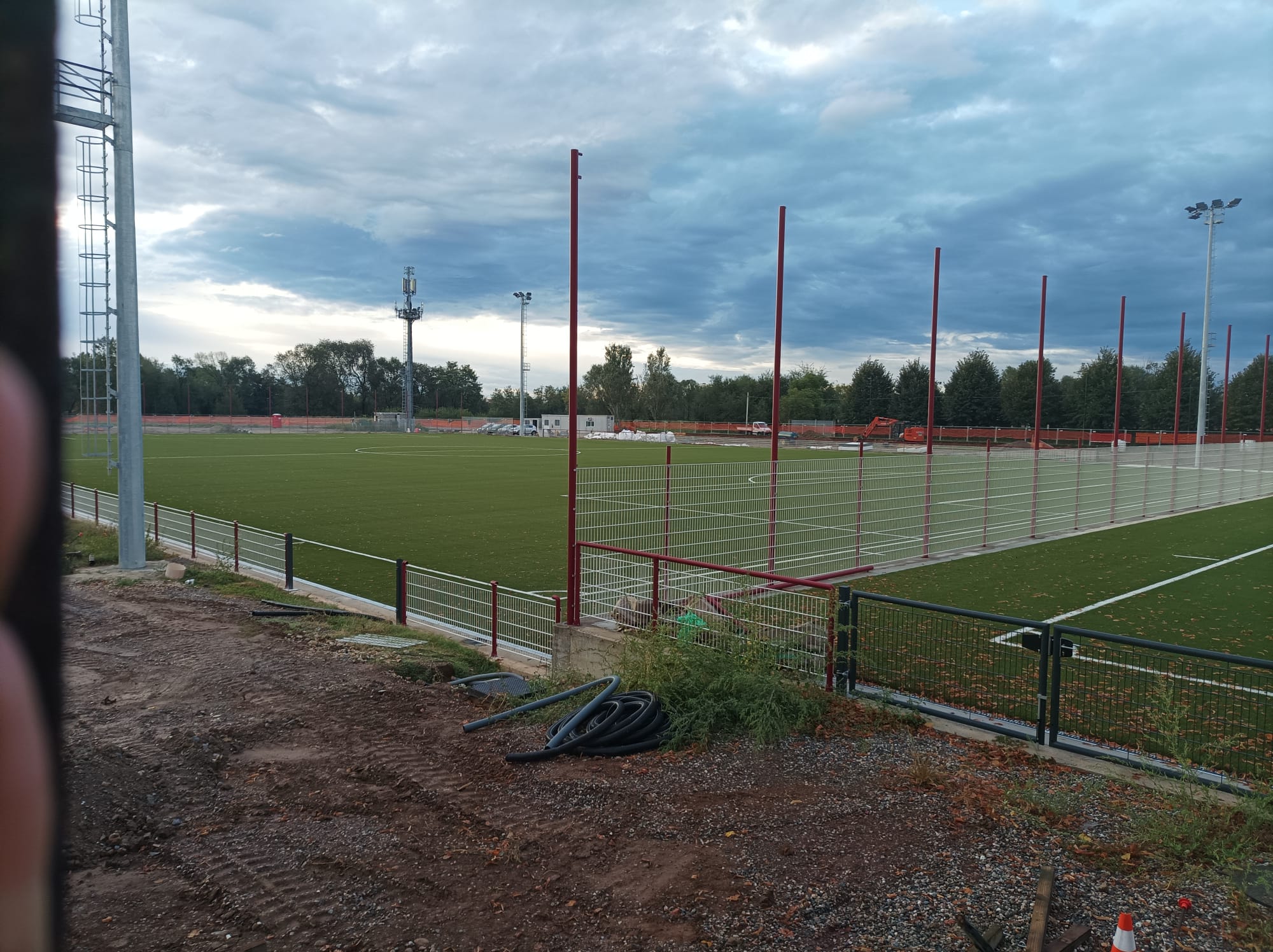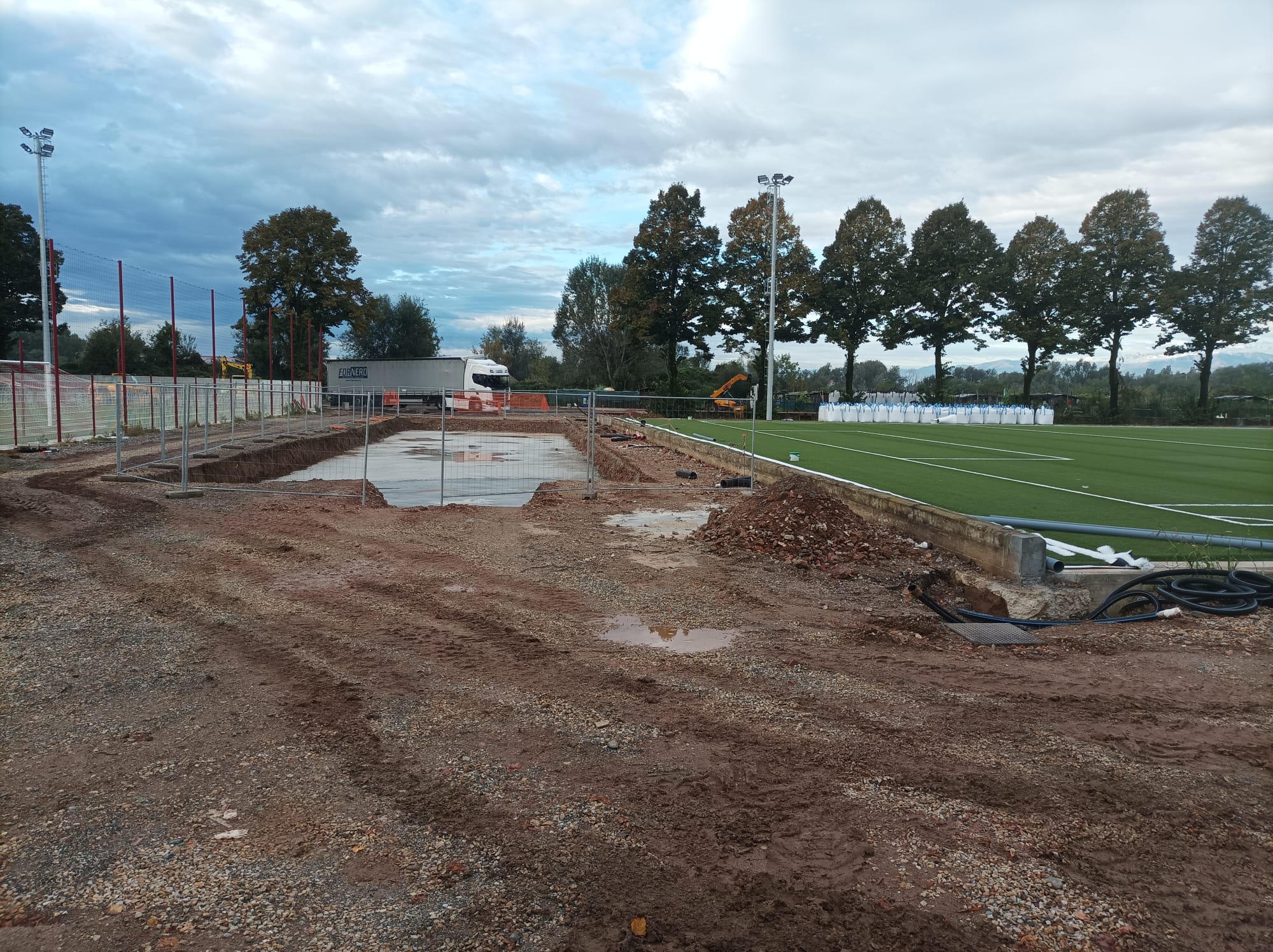 I quattro campi da calcio sono ormai stati completati e con loro sono stati posti anche i riflettori che dovranno garantire l’illuminazione in orari serali. Oltre ai tre terreni di gioco regolamentari, è stato posto anche il quarto, più piccolo e a disposizione anche della cittadinanza. La strada che divideva i primi tre campi dal quarto è ormai chiusa al traffico: una colata di cemento ha preceduto i lavori per la costruzione di un blocco di spogliatoi.