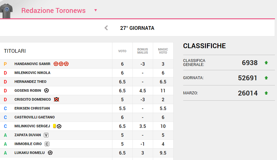 Si è conclusa la 27^ giornata del campionato di Serie A, la prima completa post covid. La redazione di Toro News totalizza 70,5 punti frutto di un undici molto altalenante nei voti. La redazione si trova ora alla posizione 6938 della classifica generale.