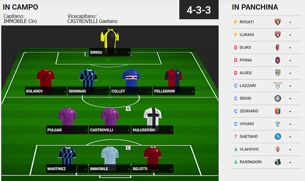 Redazione Toro News (4-3-3): Sirigu; Kolarov, Skriniar, Colley, Pellegrini; Pulgar, Castrovilli, Kulusevski; Martinez, Belotti, Immobile.