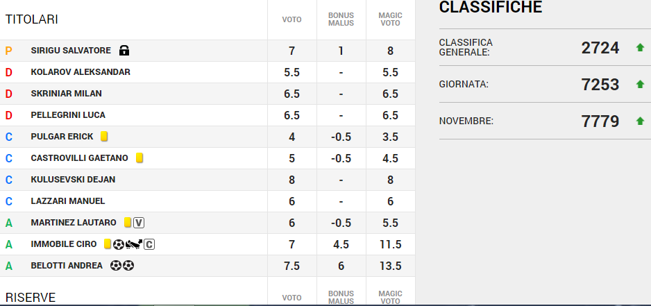 Immobile: Ormai non è una novità; destro, sinistro, di testa o su rigore, Ciro va sempre in gol e anche contro il Lecce non delude. Dal dischetto non sbaglia e inoltre firma un assist che arricchisce il suo voto. Ovviamente non manca il bonus capitano. Fantavoto: 11,5.