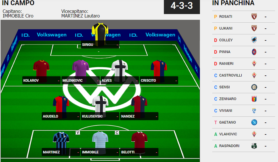 Redazione Toro News (4-3-3): Sirigu; Kolarov, Milenkovic, Alves, Criscito; Agudelo, Kulusevski, Nandez; Lautaro Martinez, Immobile, Belotti.