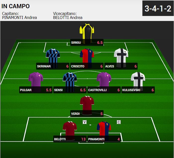 - Belotti: il suo voto è come quello di Sirigu (7,), ma il suo fantavoto è per distacco il più alto della rosa. 13 il totale per il gallo grazie alla doppietta realizzata contro il Milan che ha regalato i 3 punti ai granata, frutto di un bonus da 6 punti per la doppietta -0,5 del cartellino giallo rimediato nel primo tempo.