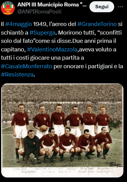ANPI III Municipio di Roma propone un ricordo storico che si lega con la Resistenza: "Il #4maggio 1949, l’aereo del #GrandeTorino si schiantò a #Superga. Morirono tutti, “sconfitti solo dal fato”come si disse.Due anni prima il capitano, #ValentinoMazzola,aveva voluto a tutti i costi giocare una partita a #CasaleMonferrato per onorare i partigiani e la #Resistenza".