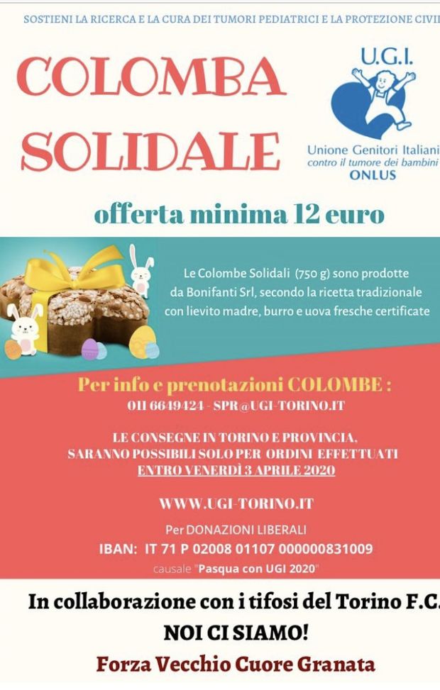 I tifosi del Toro e Casa Ugi, insieme per un fine comune: raccogliere soldi per la ricerca e la cura dei tumori pediatrici e la Protezione Civile. Sono in vendita, con offerta minima di 12€, delle colombe pasquali, per sostenere una buona causa.