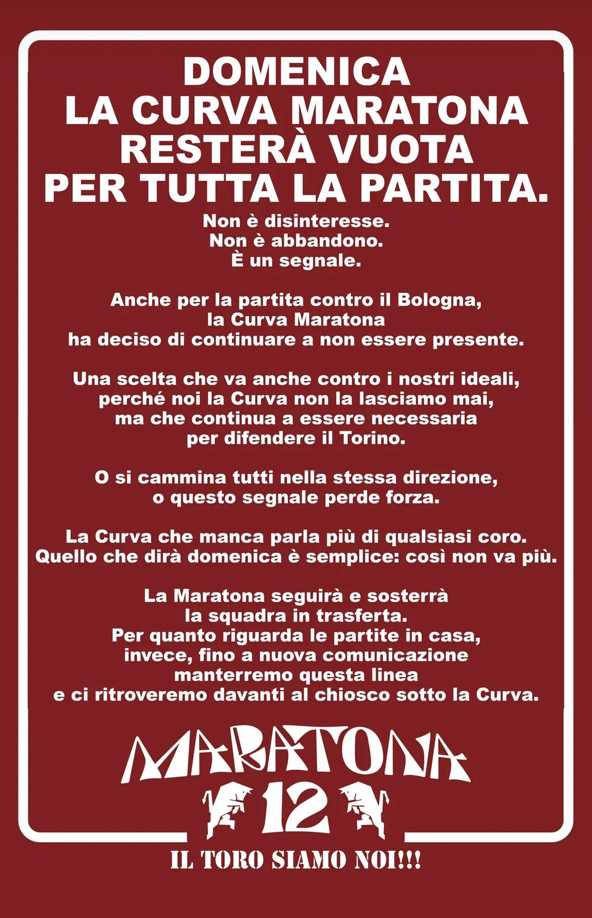 Una decisione che fa seguito all'ultima gara in casa: contro il Lecce la Maratona come metodo di contestazione ha scelto di tenere il settore vuoto per l'intera durata della partita. Una contestazione che fa seguito alle tante attività che si sono organizzate negli ultimi mesi ma che ha un effetto diverso, più forte: un effetto che va oltre il popolo granata e vuole arrivare, come messaggio, anche all'esterno. Nuove misure, dunque: la Maratona ha deciso che continuerà a sostenere la squadra in trasferta ma che "fino a nuova comunicazione", lascerà la curva vuota per tutte le partite casalinghe. Una decisione forte, che la Maratona non intende abbandonare. Di seguito il comunicato dei tifosi organizzati granata uniti sotto il nome "Maratona 12".