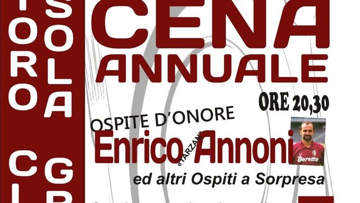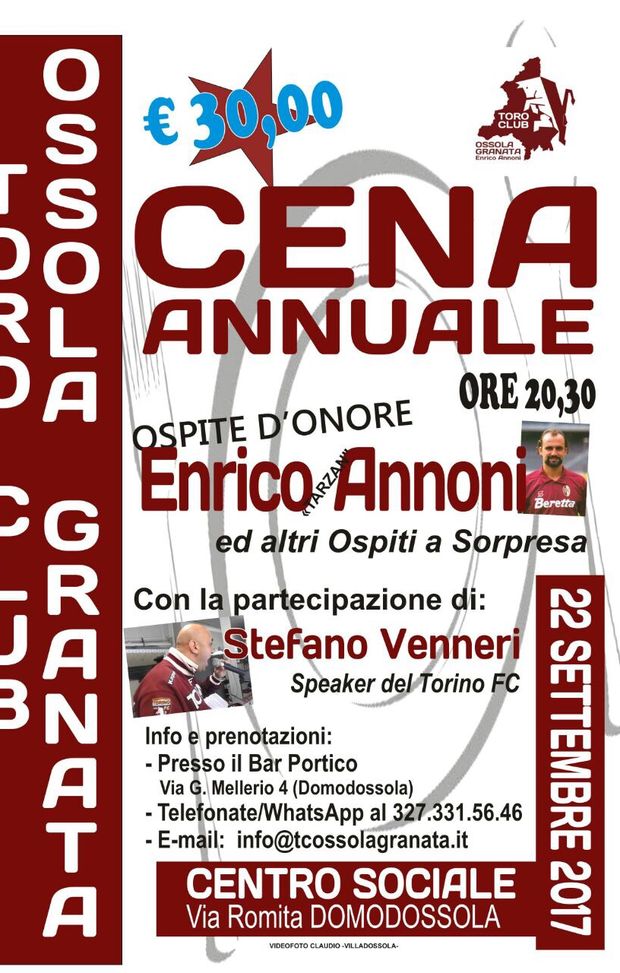 Cena annuale in vista, per il TC "Ossola Granata" di Domodossola, che domani, 22 settembre, organizzerà la cena annuale, con ospiti d'eccezione: presenti, infatti, lo speaker del Torino Stefano Venneri e gli ex giocatori Beppe Scienza ed Enrico Annoni, per una serata a tinte granata. Di seguito la locandina dell'evento.