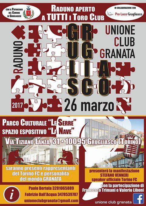 Per questa Domenica è stato organizzato un evento che coinvolge tutti i Toro Club. Il raduno andrà in scena a Grugliasco presso il Parco Culturale "Le Serre" in Via Lanza 31. A condurre l'evento ci sarà Stefano Venneri (speaker ufficiale del Torino FC); inoltre all'evento saranno presenti alcuni rappresentanti della società e alcune personalità del mondo granata come Paolino Pulici, oltre a Valerio Liboni e Francesco Trimani. Per ricevere maggiori informazioni riguardo all'evento questa è la mail alla quale è possibile fare riferimento: unioneclubgranata@gmail.com.