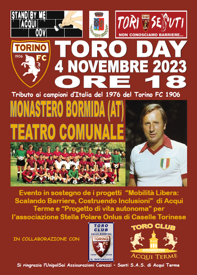 L’associazione "Stand by me Acqui ODV" di Acqui Terme assieme al comune di Monastero Bormida ha annunciato un evento particolare intitolato "Toro-Day" che permetterà ai tifosi granata di incontrare i Campioni d'Italia del Torino della stagione 1975/76. L'evento comincerà con la celebrazione di quella squadra rimasta nella storia del club granata e in seguito interverranno alcuni membri di spicco come Luciano Castellini, Nello Santin, Roberto Salvadori, Patrizio Sala, Renato Zaccarelli, Claudio Sala e Amos Ferrini, il figlio del mai dimenticato Giorgio. In seguito ci saranno i festeggiamenti e una cena benefica organizzata grazie anche al Toro Club Acqui Terme, il Toro Club Valle Bormida G. Bertonasco e infine anche il Toro Club Tori Seduti.