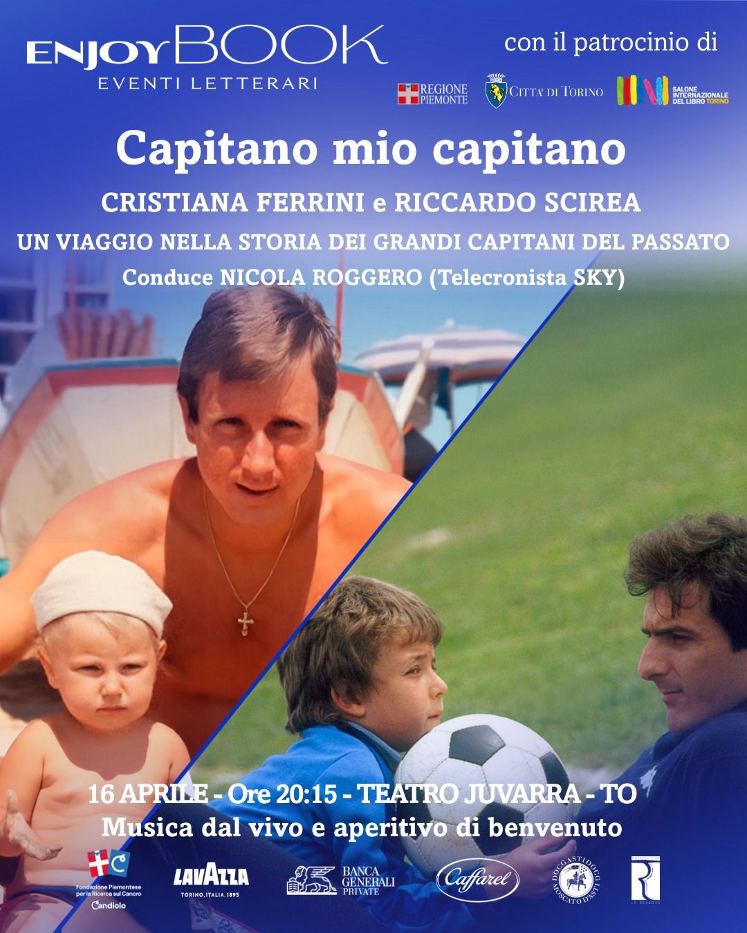 Nuovo appuntamento della rassegna culturale organizzata da EnjoyBook2026. Giovedì 16 aprile, alle ore 20.15, si terrà presso il Teatro Juvarra di Torino la presentazione del libro “Capitano mio Capitano – Un viaggio nella storia dei grandi capitani del passato”. Ospiti della serata saranno gli autori Cristiana Ferrini e Riccardo Scirea, figli rispettivamente dei grandi calciatori e leggende delle due squadre Torino e Juventus, ovvero Giorgio Ferrini e Gaetano Scirea. Attraverso i loro racconti, entrambi gli autori daranno modo al pubblico di scoprire storie, curiosità e aneddoti personali delle due grandi icone del calcio italiano. Condurrà la serata al Juvarra Nicola Roggero, telecronista di Sky Sport. I biglietti sono acquistabili al costo di 33 euro (di cui 3€ devoluti alla Fondazione Piemontese per la Ricerca sul Cancro di Candiolo). Inoltre, la presentazione del libro sarà accompagnata da musica dal vivo e un aperitivo di benvenuto.
