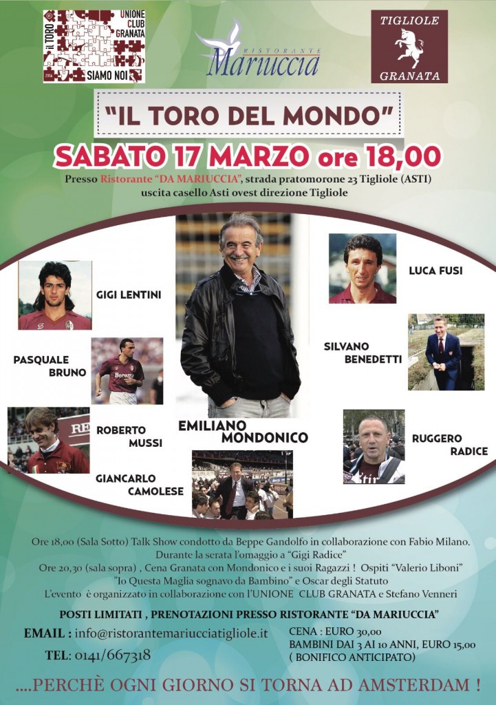 Una straordinaria serata quella promossa dal Ristorante “Da Mariuccia” di Pratomorone ( Tigliole – Asti)- ristorante Granata - con la collaborazione di un gruppo di tifosi granata di Tigliole. Un evento unico che si terrà SABATO 17 Marzo.