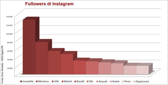 "Se nell’analisi dovessimo adottare solo Instagram, Josef Martinez, con una base di oltre 70 mila seguaci andrebbe a scalzare il secondo posto al Capitano e se invece dovessimo utilizzare solo Facebook scopriremmo che, oltre ai primi tre classificati ci sono solo altri due calciatori che hanno un profilo ufficialmente dichiarato ed aggiornato, Afriyie Acquah e Bruno Peres, che fra l’altro lo condivide con la moglie Camila.