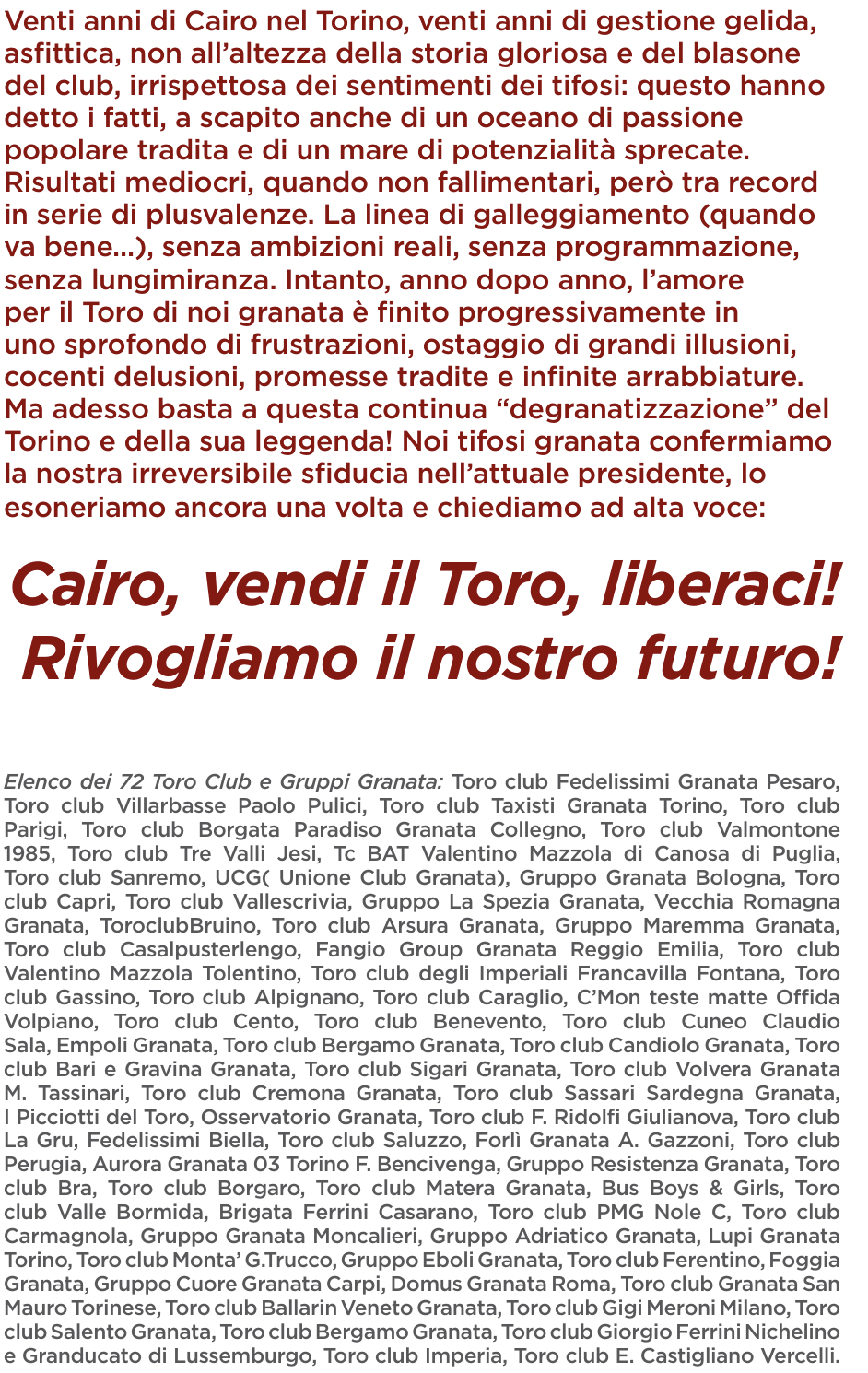 L'edizione odierna di Tuttosport oltre alle notizie riguardanti il mondo granata ha pubblicato una pagina a pagamento contenente una lettera a nome di 72 Toro Club e Gruppi Granata. All'interno dello spazio acquistato dai firmatari, viene criticato aspramente l'operato di Urbano Cairo durante questo ventennio di gestione del Torino. "Adesso basta a questa continua “degranatizzazione” del Torino e della sua leggenda!" - scrivono i tifosi all'interno della lettera - "Noi tifosi granata confermiamo la nostra irreversibile sfiducia nell’attuale presidente". Il contenuto termina con un messaggio direttamente rivolto al patron granata: "Cairo, vendi il Toro, liberaci! Rivogliamo il nostro futuro!". A seguire il contenuto integrale della lettera.