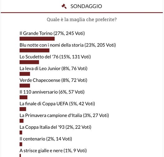"Il cuore batte sempre per chi dal 4 maggio 1949 assiste il Torino dall'alto. Valentino Mazzola e compagni sono legati con tutti i tifosi granata con un legame affettivo indissolubile. Ieri i lettori di Toro News sono stati chiamati a votare la maglia più bella della storia granata (da una selezione di undici casacche) e la scelta è ricaduta su quella degli "Invincibili" che rappresenta qualcosa di sacro per tutti i tifosi della società piemontese. Al secondo posto i tifosi si sono espressi per la maglia blu notte, dove c'erano stampati tutti i nomi che hanno fatto la storia del Torino. Scritte bianche che andavano a comporre un Toro suggestivo, sullo sfondo blu della casacca. A concludere il podio la divisa che indossarono Pulici e compagni quando vinsero lo scudetto nel 1976. La maglia era granata con un Toro bianco stampato sul petto. Nella grafica sottostante tutte le preferenze dei lettori nel dettaglio.