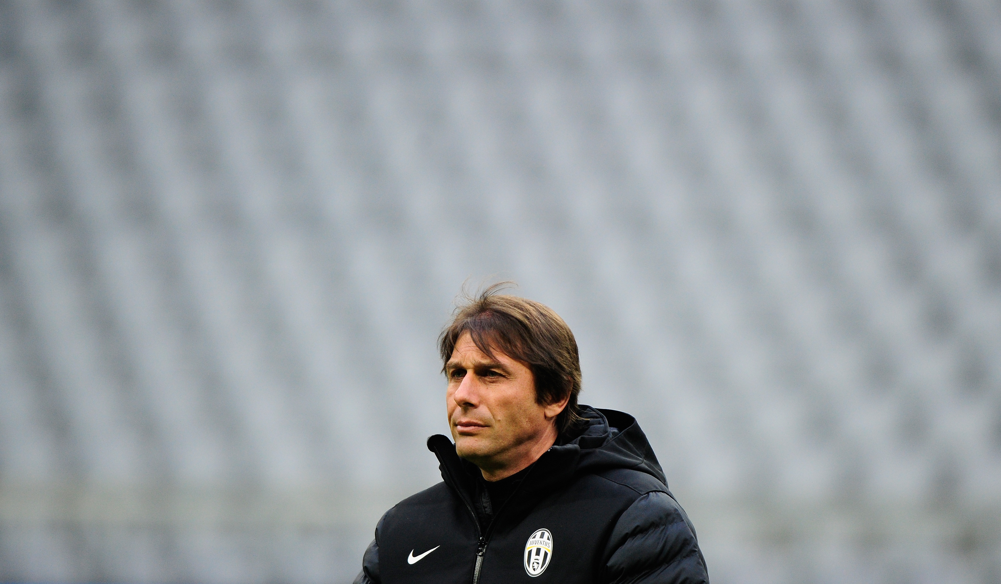 MUNICH, GERMANY - APRIL 01: Head coach Antonio Conte (L) of Juventus looks on next to Arturo Vidal during a training session prior to the Champions League quarter-final match between FC Bayern Muenchen and Juventus at Allianz Arena on April 1, 2013 in Munich, Germany. (Photo by Lennart Preiss/Bongarts/Getty Images)