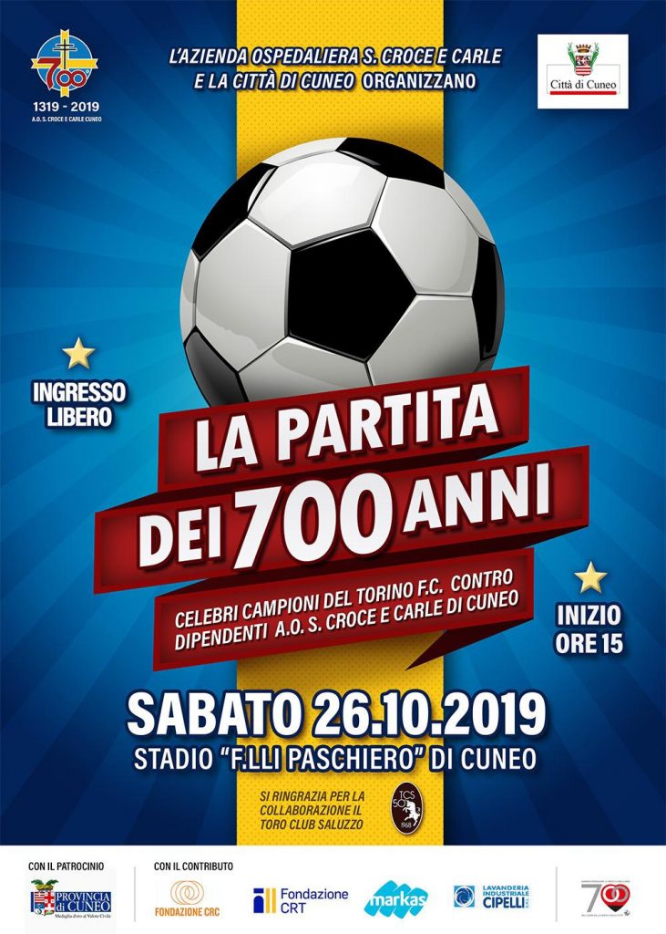 Sabato pomeriggio allo stadio Fratelli Paschiero di Cuneo verrà disputata "La partita dei 700 anni", match per celebrare l'anniversario dalla nascita dell'Ospedale Santa Croce e Carle. Al match, il cui ingresso sarà gratuito, si sfideranno le Vecchie Glorie del Torino e i dipendenti dell'Azienda Ospedaliera. L'evento è stato organizzato dal Comune di Cuneo, dai Toro Club Saluzzo, Mondovì, Caraglio e Busca, dall'Associazione Ex Calciatori Granata e dall'A.O. Santa Croce e Carle. Tra le vecchia glorie del Torino ci saranno: Nello Santin, Angelo Cereser, Natalino Fossati, Giuseppe Pallavicini, Serino Rampanti, Enrico Fantini, Luca Mezzano e l’attuale ds del Torino Massimo Bava. A bordocampo accompagnerà il match lo speaker ufficiale del Torino Stefano Venneri.