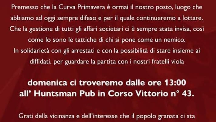 ""Premesso che la Curva Primavera è ormai il nostro posto, luogo che abbiamo ad oggi sempre difeso e per il quale continueremo a lottare. Che la gestione di tutti gli affari societari ci è sempre stata invisa, così come lo sono le tattiche di chi si pone come un nemico. In solidarietà con gli arrestati e con la possibilità di stare insieme ai diffidati, per guardare la partita contro i nostri fratelli viola domenica ci troveremo dalle ore 13:00 all'Huntsman Pub in Corso Vittorio n°43. Grati della vicinanza e dell'interesse che il popolo granata ci sta dimostrando, vi aspettiamo per bere più di una birra insieme".