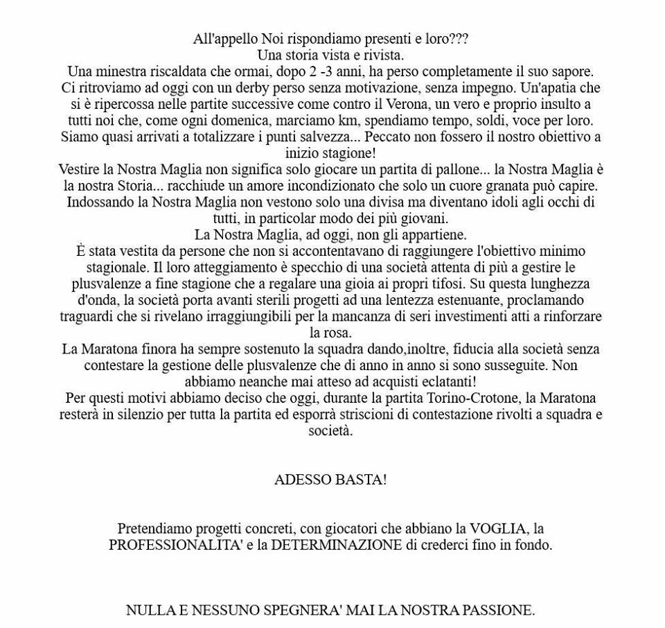 La Nostra Maglia, ad oggi, non gli appartiene. E’ stata vestita da persone che si accontentavano di raggiungere l’obiettivo minimo stagionale. Il loro atteggiamento è specchio di una società attenta di più a gestire le plusvalenze a fine stagione che a regalare una gioia ai propri tifosi. Su questa lunghezza d’onda, la società porta avanti sterili progetti ad una lentezza estenuante, proclamando traguardi che si rivelano irraggiungibili per la mancanza di seri investimenti a rinforzare la rosa. La Maratona fin ora ha sempre sostenuto la squadra dando, inoltre, fiducia alla società senza contestare la gestione delle plusvalenze che di anno in anno si sono susseguite. Non abbiamo neanche mai atteso acquisti eclatanti! Per questi motivi abbiamo deciso che durante la partita Torino-Crotone, la Maratona resterà in silenzio per tutta la partita ed esporrà striscioni di contestazione rivolti a squadra e società. ADESSO BASTA! Pretendiamo progetti concreti, con giocatori che abbiano la voglia, la personalità e la determinazione di crederci fino in fondo. Nulla e nessuno spegnerà mai la nostra passione“.