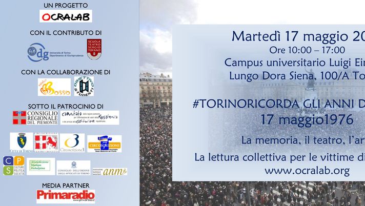 Martedì 17 maggio, presso il Campus universitario Luigi Einaudi di Torino, dalle 10:00 alle 17:00, avrà luogo l'evento dal titolo "Torino ricorda gli Anni di Piombo - 17/5/1976", curato da Ocra Lab Idee per comunicare.